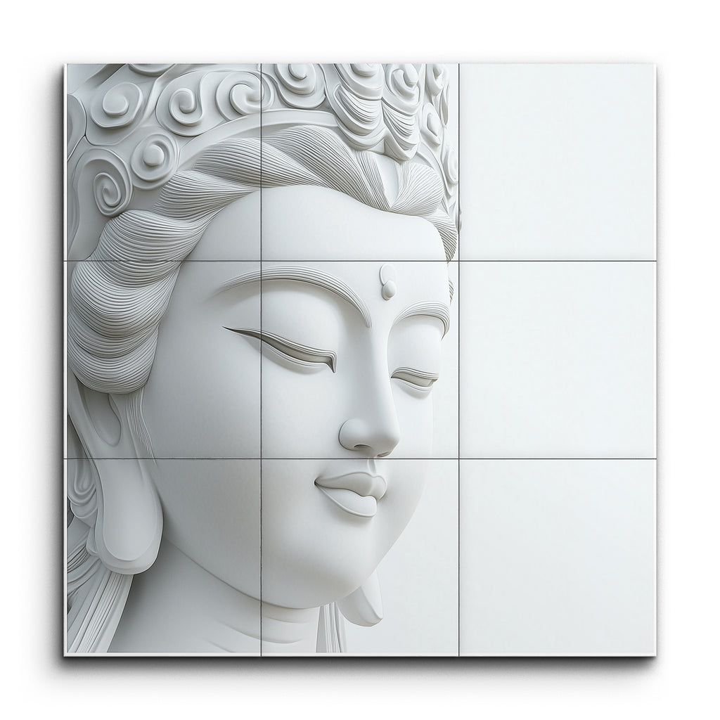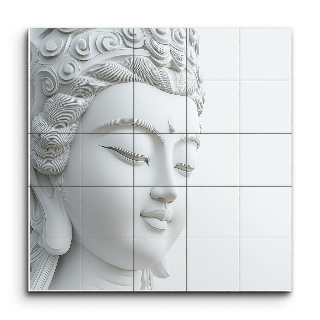 This tile mural showcases a serene figure inspired by Buddhist iconography, depicted in profile with eyes gently closed. The monochromatic palette emphasizes the smooth, flowing lines and intricate details, from the delicate facial features to the wave-like patterns of the hair. Traditional elements like elongated earlobes and a prominent urna enhance its classical feel. Subtle use of light and shadow creates a gentle contrast, highlighting the figure's contours and evoking a sense of tranquility and inner peace.