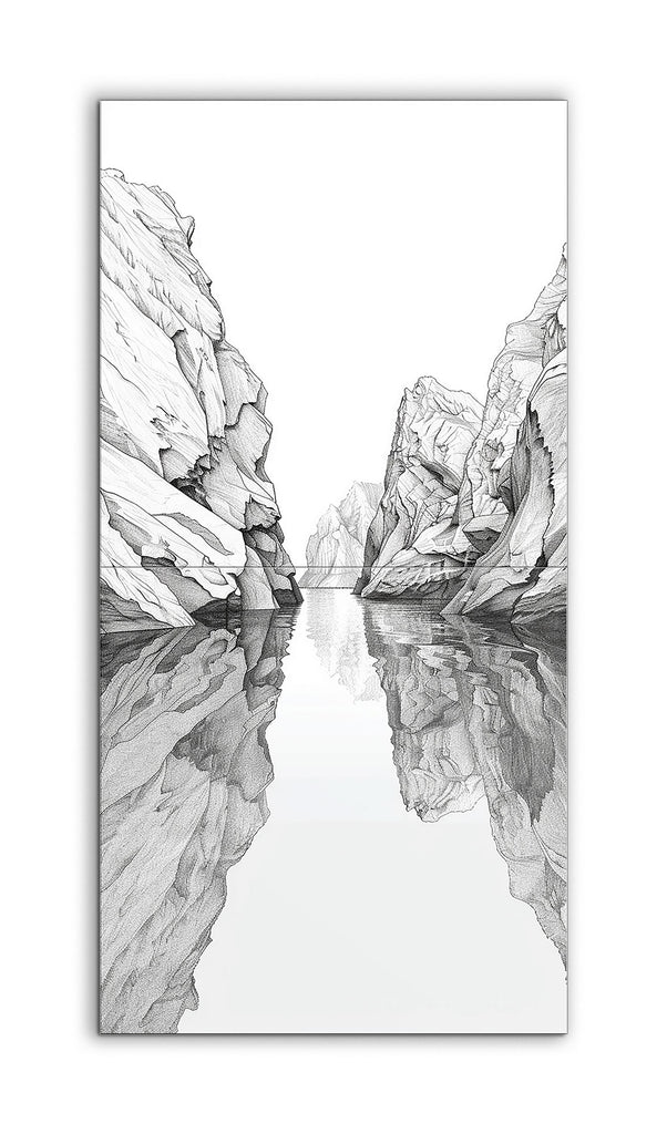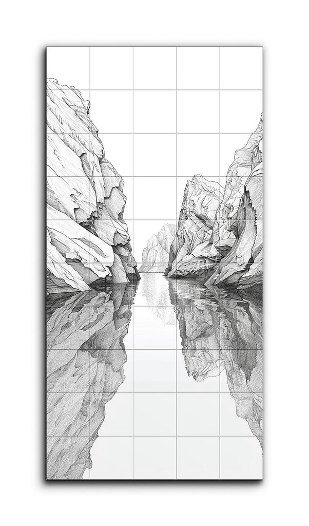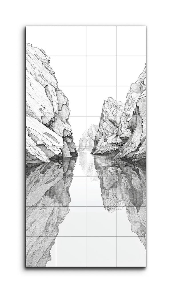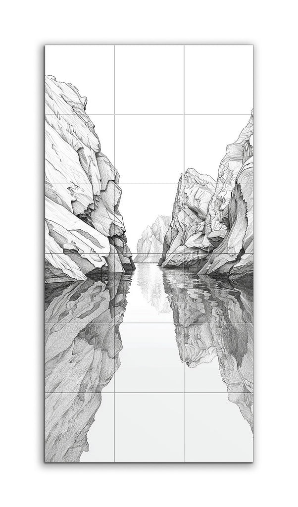 This tile mural showcases a detailed black-and-white illustration of a serene canyon landscape. Dominated by two towering rock formations that converge towards the center, the artwork creates a narrow passage highlighted by intricate lines and shading. The calm water below mirrors the rocks, enhancing the scene's depth and tranquility. Distant rock formations in the background suggest the canyon's continuation, while the absence of color emphasizes the intricate details and meditative quality of the landscape.