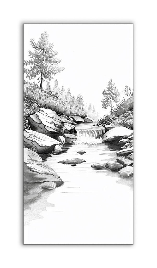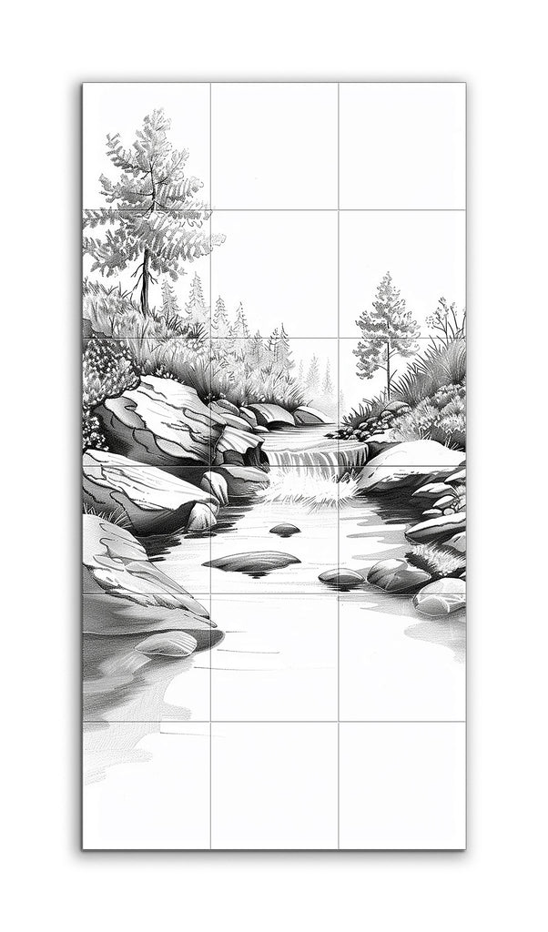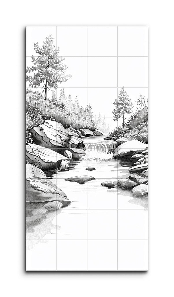 This monochromatic tile mural captures a serene natural landscape with meticulous detail. A gently flowing stream cascades over a small waterfall, surrounded by smooth rocks, with the water's movement and reflections expertly rendered. Lush vegetation with various plants and bushes adds texture, while tall, detailed trees in the background provide depth and distance. The clean, uncluttered style and balanced composition create a peaceful, harmonious atmosphere.