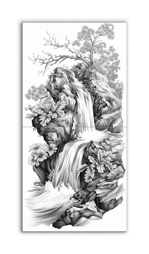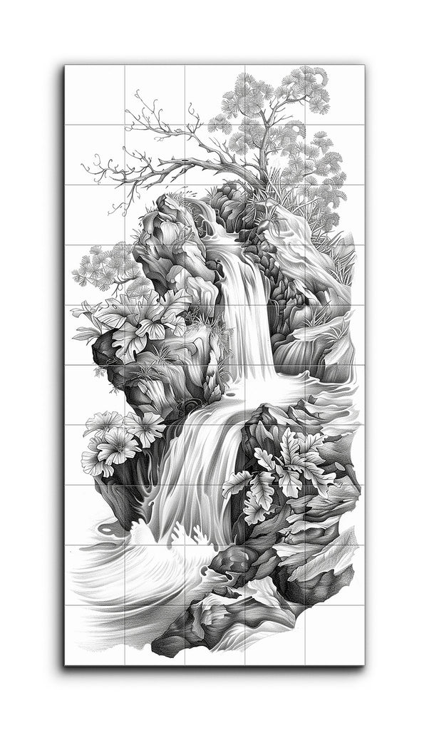 This tile mural features a serene landscape with a cascading waterfall flowing through a rocky terrain. The waterfall descends in multiple tiers, adding a sense of movement and tranquility. The rocks are intricately detailed, showcasing various textures and layers for a realistic, rugged appearance. Surrounding the waterfall is lush vegetation with large leaves and flowers, offering contrast to the jagged rocks. A tree with bare branches at the top adds starkness and balance. Rendered in black and white, the piece emphasizes dramatic contrasts and textures, creating a harmonious and visually engaging composition.
