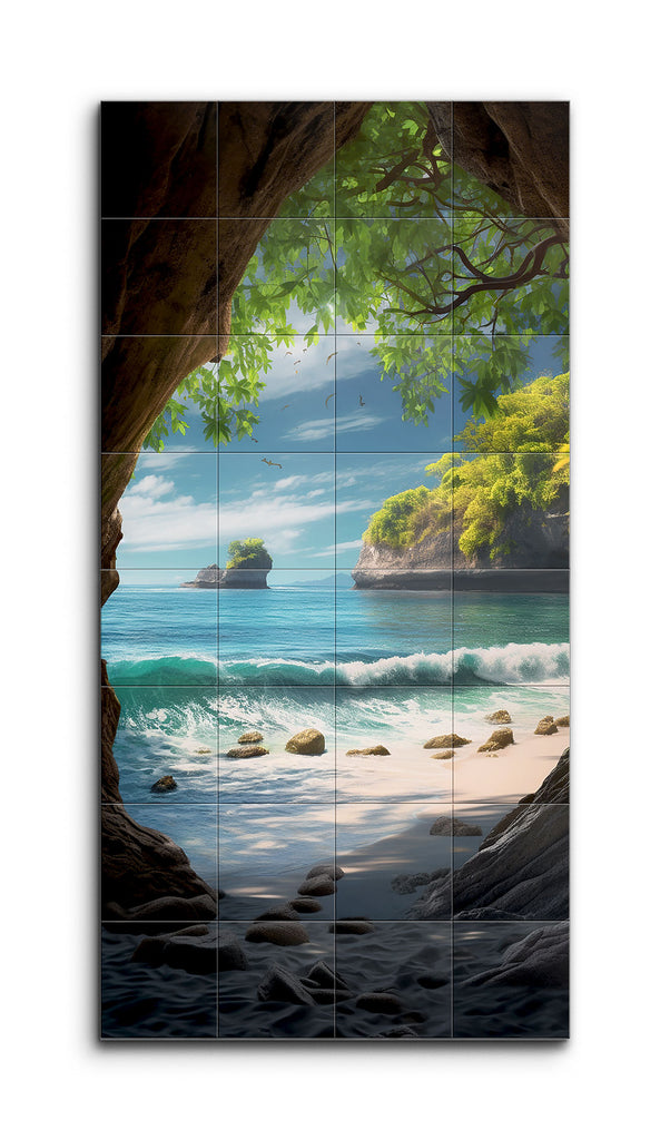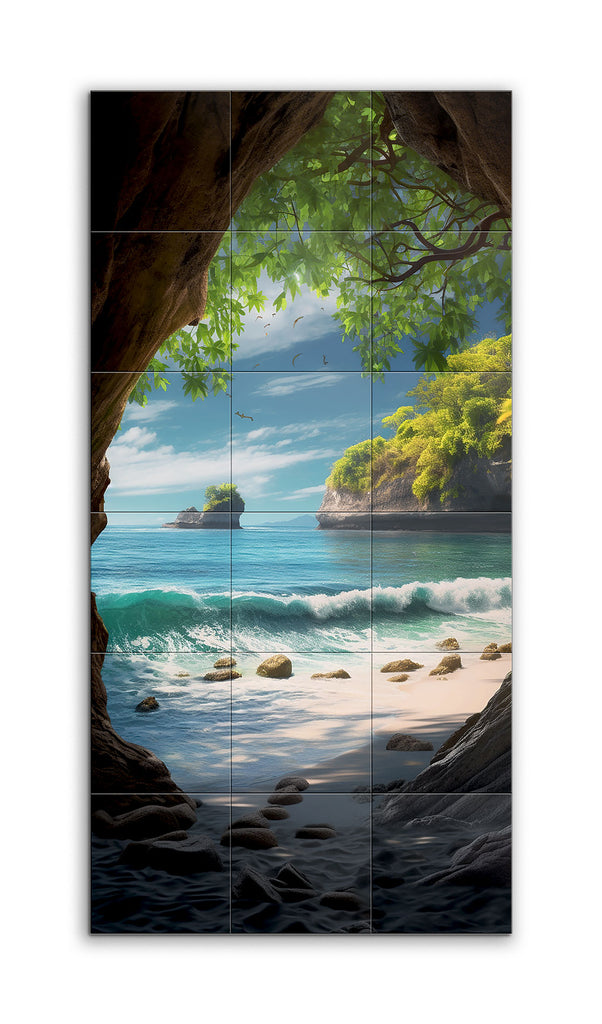 This tile mural captures a serene coastal scene from within a cave, where the dark, rocky interior frames a vibrant, sunlit landscape. A sandy beach, scattered with rocks, is gently caressed by turquoise waves, depicted with dynamic motion. Beyond, a calm sea stretches to the horizon, featuring a lush, rocky islet and a larger forested cliff. The clear blue sky, dotted with clouds and birds, enhances the tranquil, natural beauty. The realistic style showcases meticulous detail, vibrant colors, and a sense of depth.