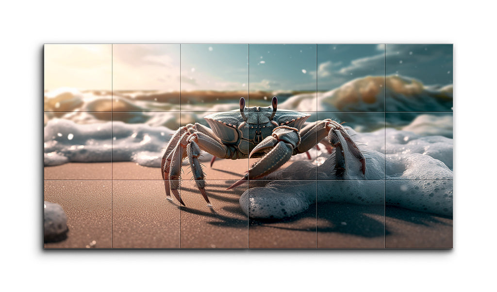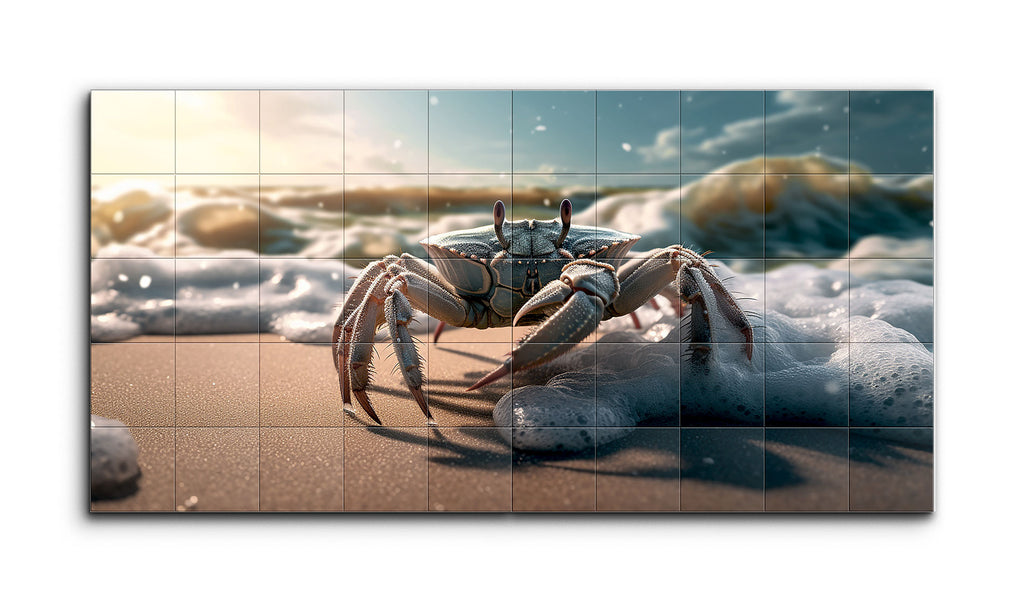 This tile mural presents a lifelike scene of a crab on a sandy beach, framed by foamy waves in the background. The crab, centrally positioned, boasts a textured exoskeleton with natural shades and subtle reflections. The beach is depicted with fine, granular sand and frothy waves, creating depth and atmosphere. Soft, warm lighting hints at sunrise or sunset, casting gentle shadows. The artwork's realism, natural lighting, and detailed textures evoke a serene coastal ambiance. The palette blends warm sandy tones with cooler sea and sky hues, capturing a tranquil moment.
