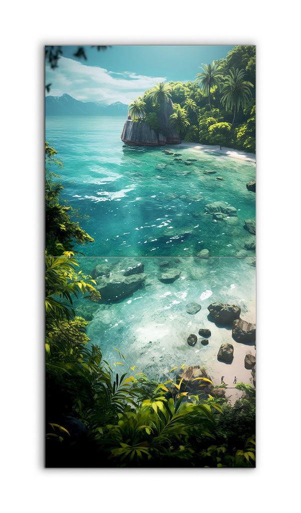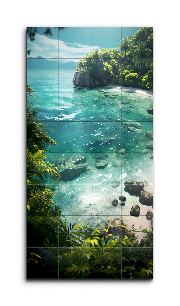 This vertically oriented tile mural captures a serene coastal scene in a lush, tropical environment. The foreground is rich with detailed, vibrant green foliage that frames a secluded beach. Sandy shores, scattered rocks, and clear turquoise waters dominate the middle ground, with shimmering light effects enhancing the tranquil atmosphere. A rocky, vegetation-covered cliff extends into the sea, leading to a distant misty mountain range. The artwork's realistic style and intricate details evoke the peaceful essence of a tropical paradise.