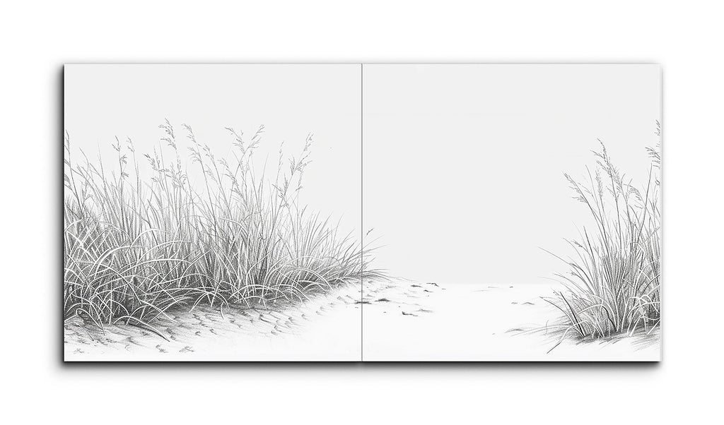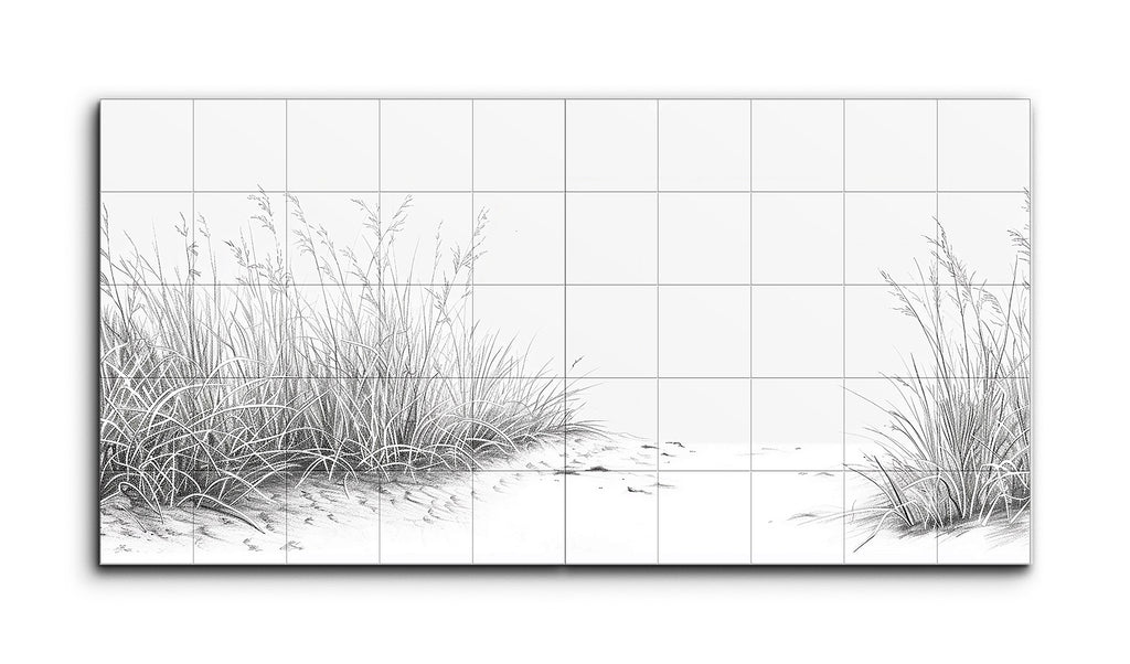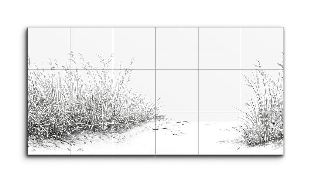 This tile mural presents a serene coastal scene in a monochromatic palette of gray shades. The composition is divided into two sections, each featuring clusters of tall, slender grasses that sway gently in the breeze. The intricately detailed grasses, with individual blades and seed heads, convey a sense of natural realism. The sandy foreground, textured and undisturbed, displays delicate footprints leading to the horizon, evoking the peacefulness of a quiet beach. The minimalist aesthetic, clean lines, and negative space enhance the intricate details of the natural elements.