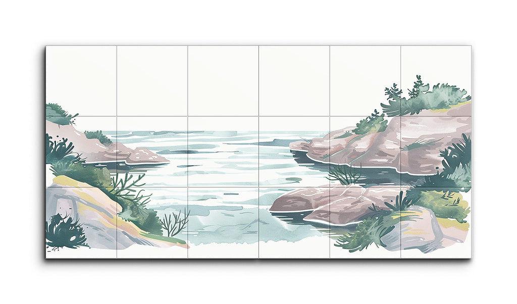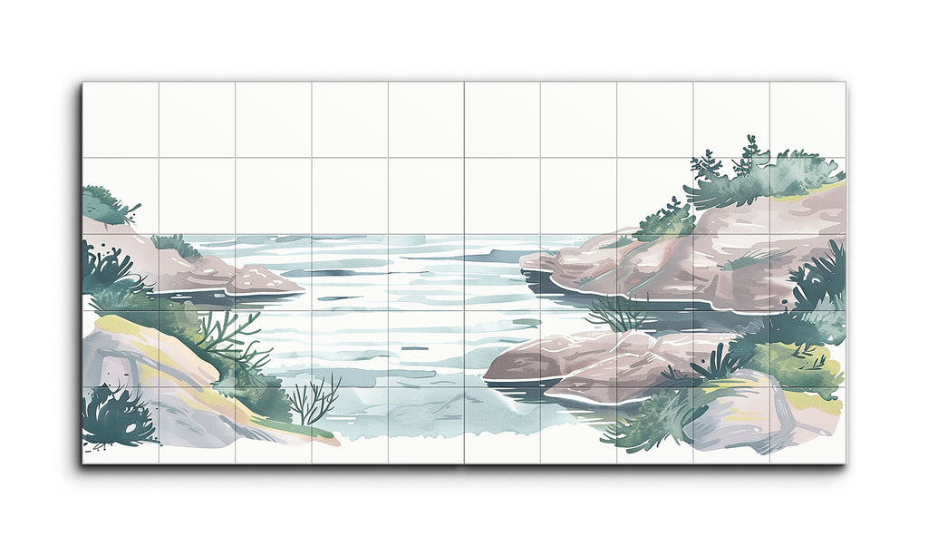 This two-panel tile mural presents a serene coastal landscape in a semi-abstract style with a soft, pastel color palette. The left panel features a rocky shoreline with smooth, sunlit rocks in beige and gray, interspersed with stylized green vegetation. The right panel continues the tranquil seascape, showcasing additional rock formations in harmonious tones. Gentle blue and green hues depict the calm water, while a high horizon line opens up the sky above. The digital brushwork or watercolor-like blending enhances the peaceful ambiance, inviting quiet reflection on nature's beauty.