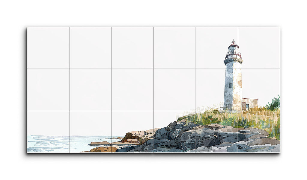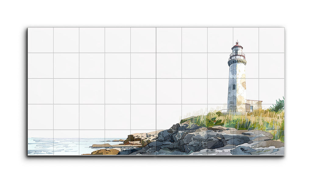 This tile mural presents a serene coastal landscape featuring a weathered lighthouse, standing tall on the right side. The rugged rocky shoreline in the foreground contrasts with the lighthouse's cylindrical, domed structure. Sparse greenery adds subtle color among the gray stones. Calm blue waves hint at a tranquil sea, while the minimalist style, with clean lines and limited colors, creates a modern, contemplative scene. The precise linework and flat color areas give the artwork a contemporary, stylized feel.