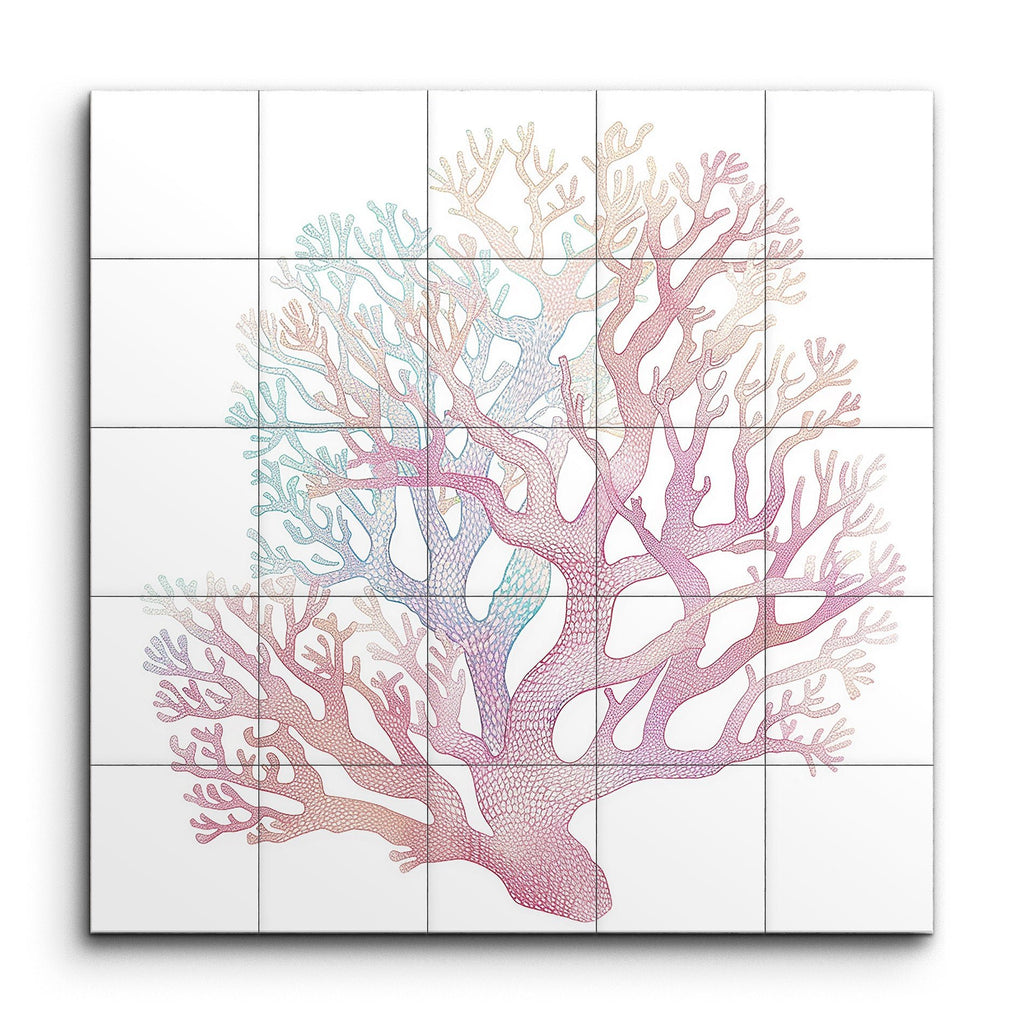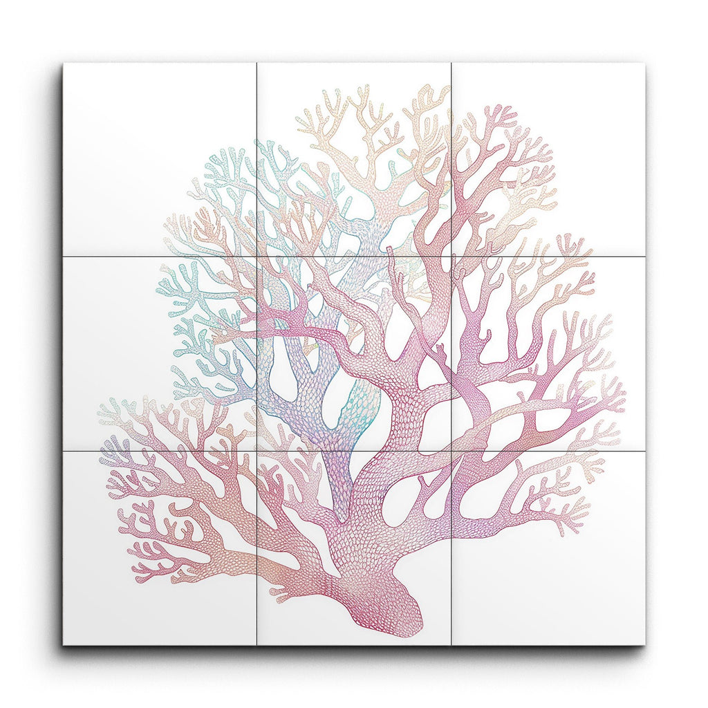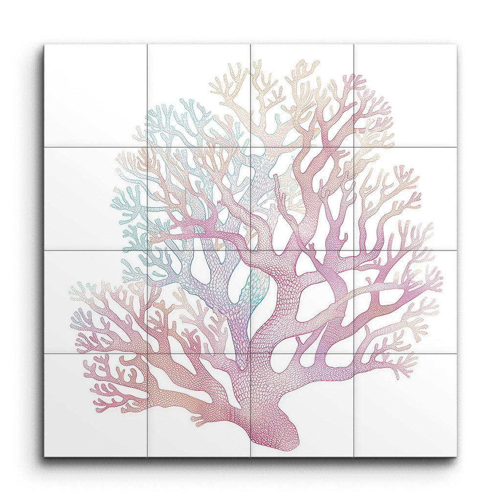 Transform your space with this captivating tile mural, featuring an intricate illustration of coral. Delicate branches extend from central stems in a tree-like structure, rendered in a soft gradient of pink, purple, and light blue. The minimalist design and fine lines create a harmonious, ethereal feel, enhanced by the use of negative space. This modern artwork combines natural beauty with contemporary elegance, making it a serene and visually stunning addition to any setting.