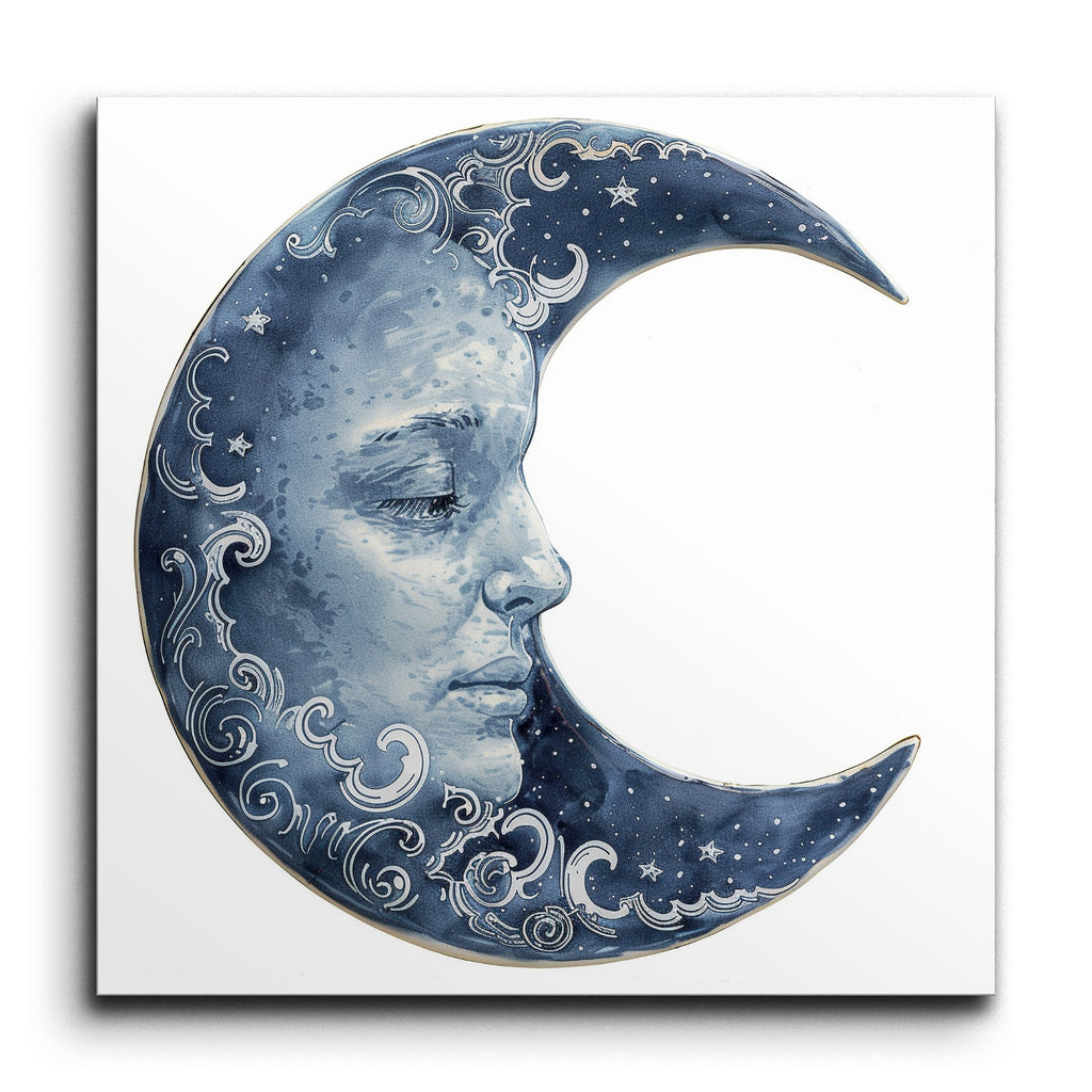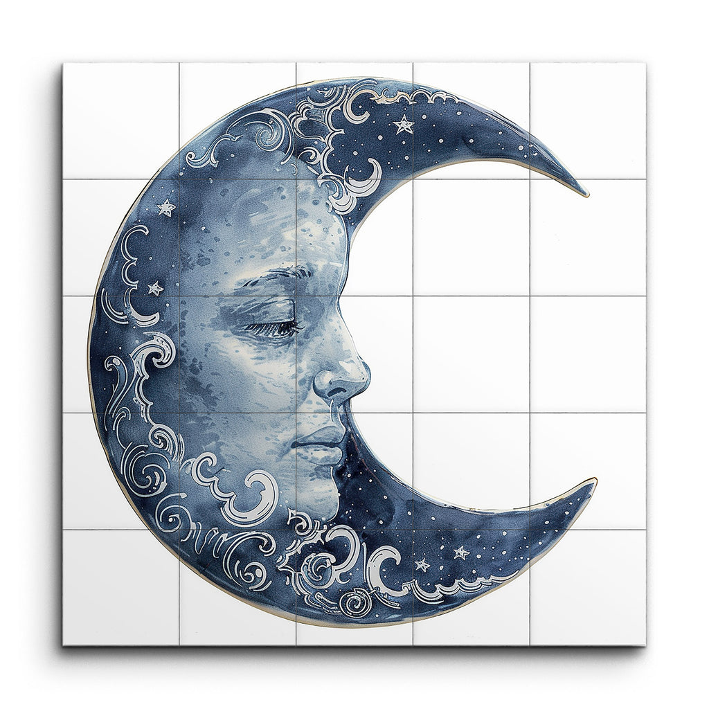 Transform your space with this enchanting tile mural, featuring a serene crescent moon with a tranquil human face, eyes gently closed in peaceful rest. Rendered in deep blues, the moon exudes a night-time aura, adorned with intricate swirling patterns and delicate stars. This artwork masterfully blends realistic detail with whimsical, mystical elements, creating a captivating and ethereal atmosphere that invites calm and imagination into your home.