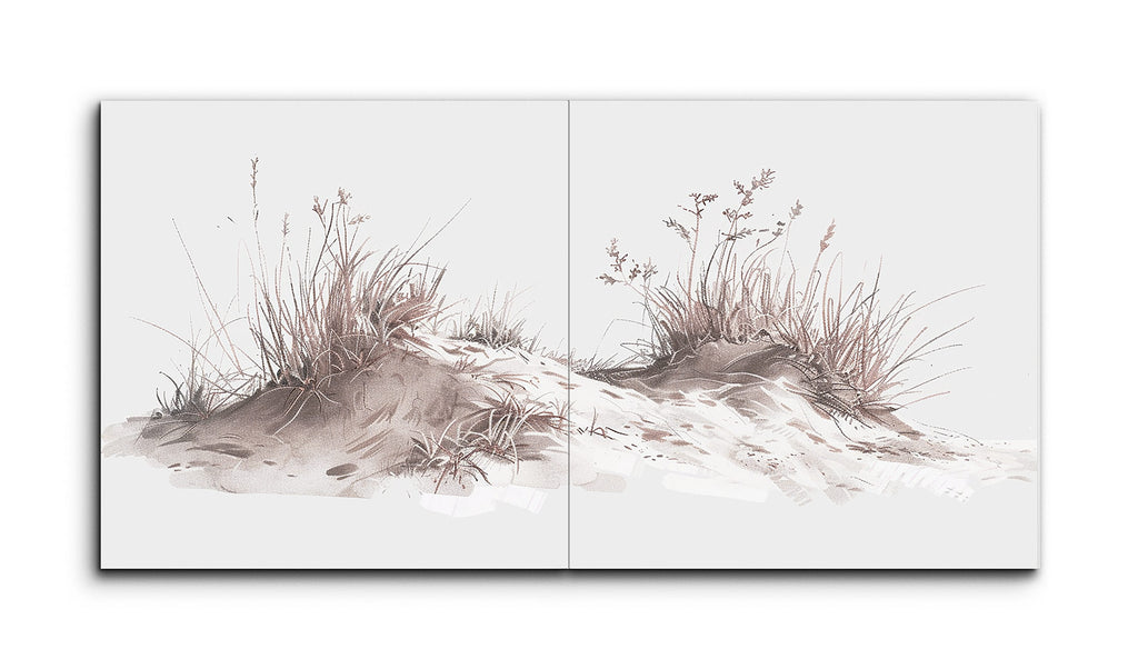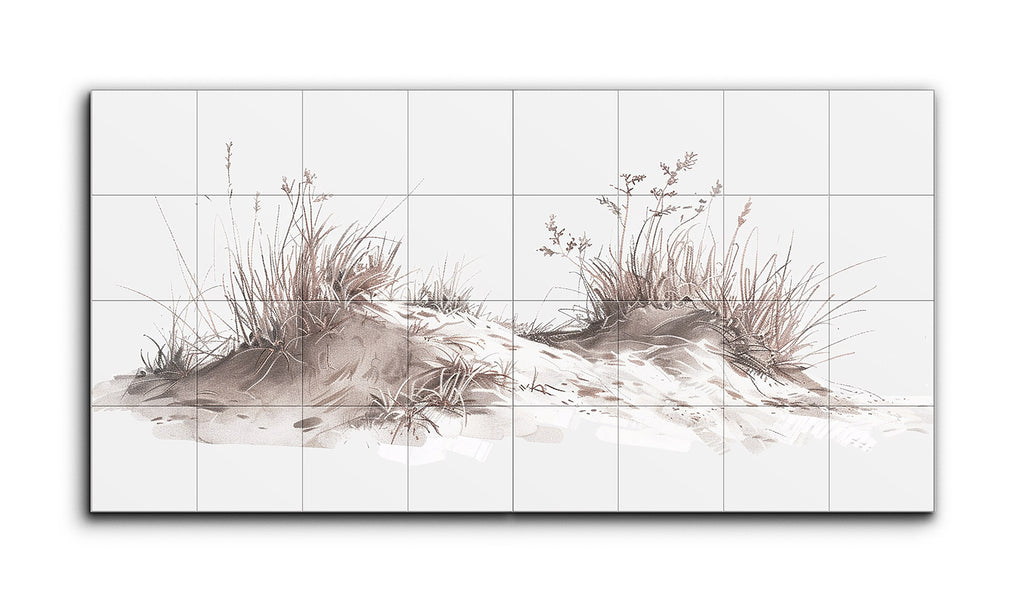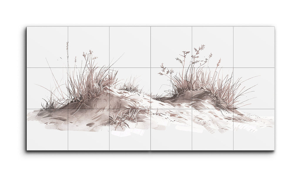 This diptych tile mural features two panels depicting mounds of earth adorned with grasses, weeds, and wildflowers. The artwork employs a muted color palette of soft earth tones, evoking a serene, possibly autumnal setting. With a minimalist style, the delicate line work and balanced composition capture the fine details and textures of the natural flora. The simplicity and elegance of the piece evoke calmness, highlighting nature's understated beauty and encouraging quiet contemplation.