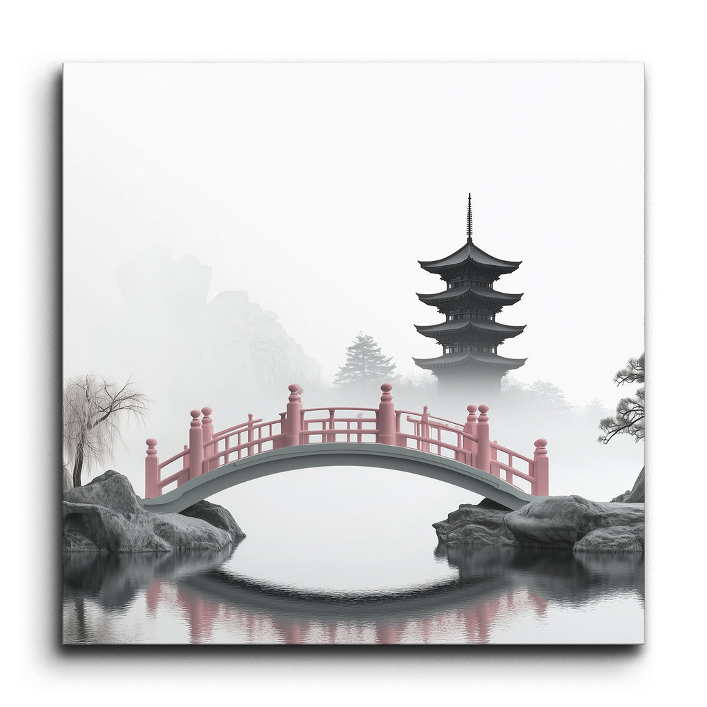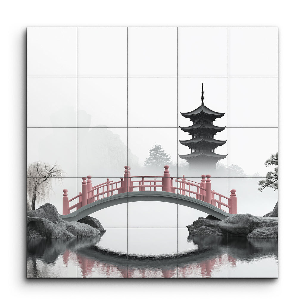 This tile mural presents a serene traditional East Asian garden scene. At its heart is a gracefully arched red bridge with ornate railings, mirrored in the calm water below, creating a balanced composition. A mist-shrouded, multi-tiered pagoda with a curved roof adds an ethereal touch. Sparse vegetation, including a bare tree and a manicured tree, flank the bridge. The muted color palette of soft grays and greens, along with the minimalist style and intricate details, evoke peace and contemplation.