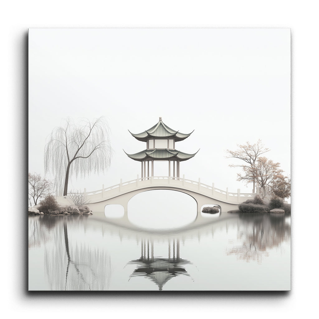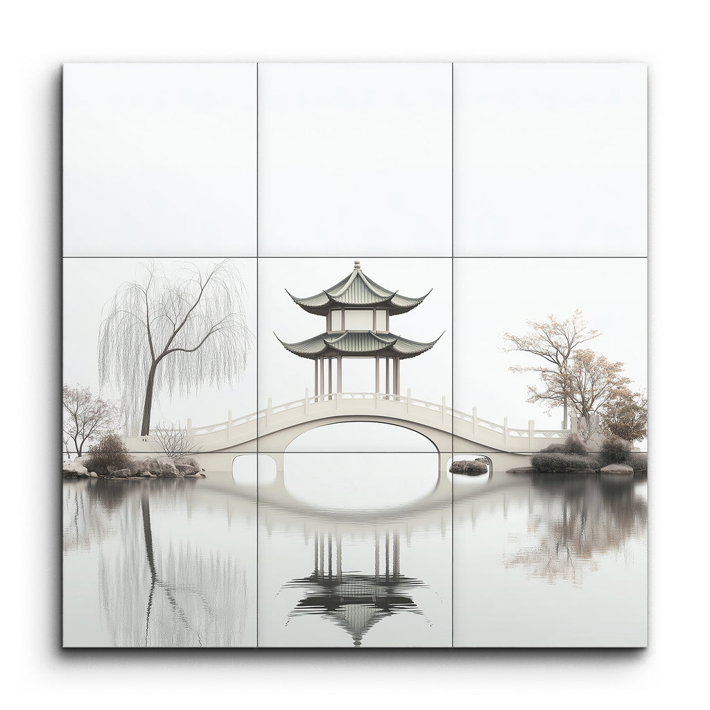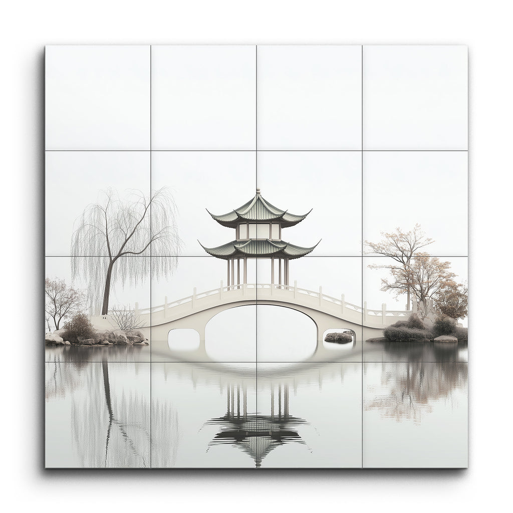 This tile mural captures a serene East Asian scene with a traditional pagoda-style bridge featuring elegant, symmetrical arches and upturned eaves. The bridge spans a calm body of water that mirrors its beauty and the surrounding elements. Delicate trees, including a weeping one with slender branches and others with sparse foliage, frame the scene. The muted color palette of pale tones and the minimalist, refined style emphasize simplicity, balance, and a timeless sense of tranquility.