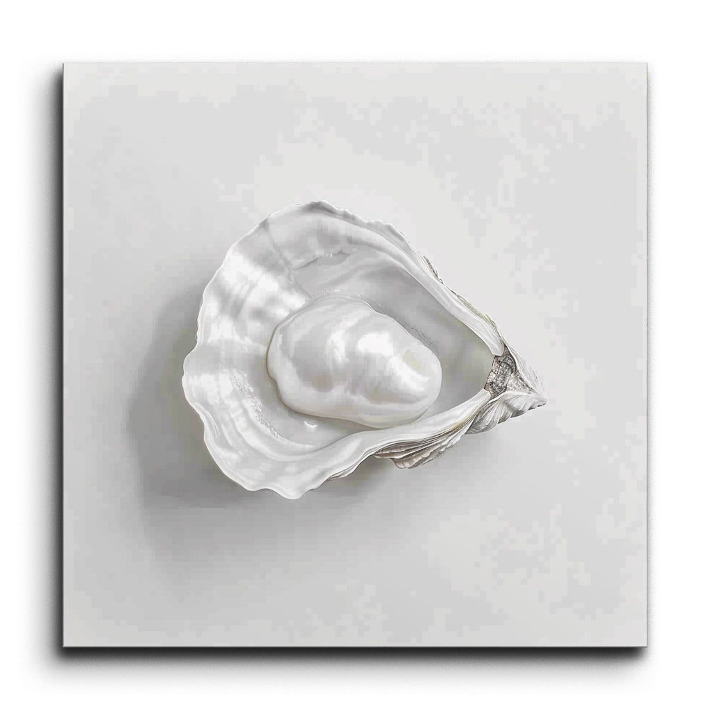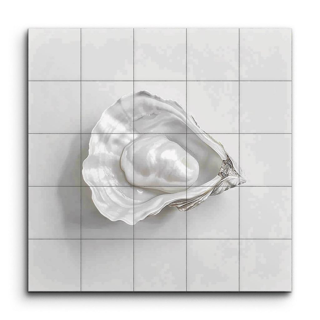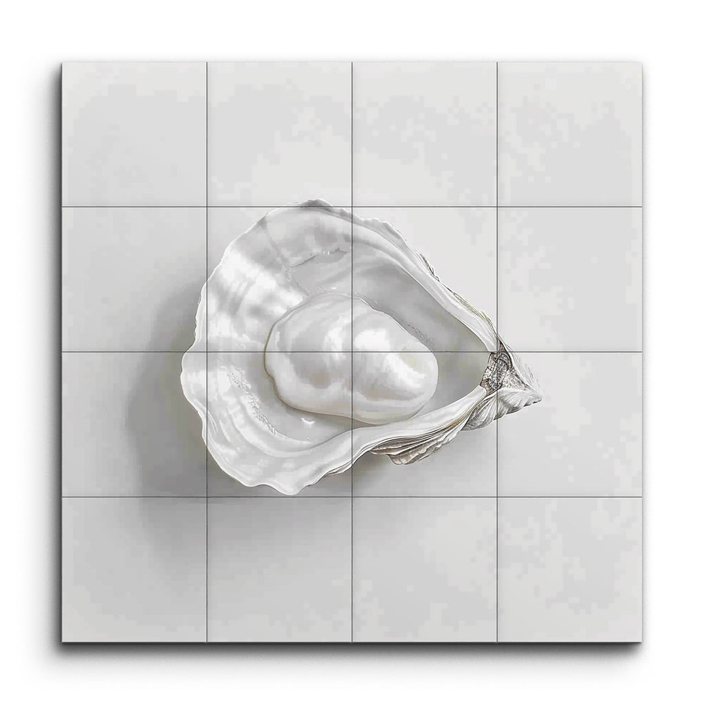 Immerse your space in the serene elegance of this hyperrealistic tile mural, featuring an exquisitely detailed open oyster shell cradling a lustrous pearl. The artist's meticulous attention to textures, shading, and light creates a lifelike representation that captures the natural ridges, curves, and pearlescent sheen of the shell. Monochromatic tones enhance the serene beauty of the composition, making it a refined and graceful focal point for any setting.