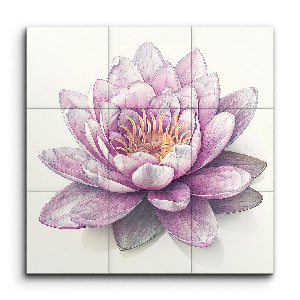 Experience the serene elegance of this stunning tile mural featuring a meticulously detailed lotus flower. Each petal is rendered in soft gradients of pink and purple, creating a lifelike, three-dimensional effect. Golden-yellow stamens add a striking contrast, while subtle veining and natural overlap enhance the flower's realism. This artwork masterfully blends realism with stylized elements, capturing the lotus's delicate beauty and intricate structure in a harmonious, visually captivating composition.