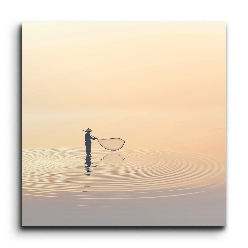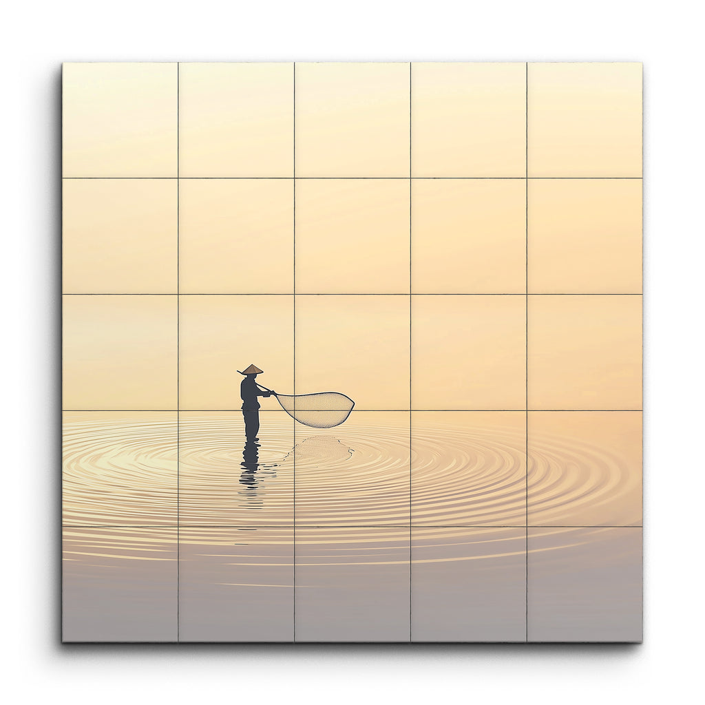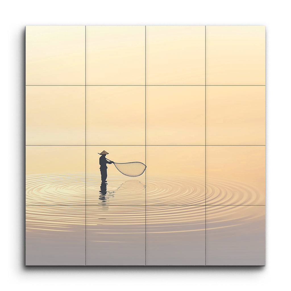 This tile mural captures a serene moment of a solitary figure standing in shallow water, fishing with a large net. The traditional conical hat worn by the figure hints at an Asian cultural context. The minimalist scene is bathed in soft, muted tones of beige and light brown, creating a tranquil and reflective atmosphere. Gentle ripples in the calm water add movement and depth, while the balanced composition naturally draws the eye to the contemplative figure, celebrating the beauty of simplicity in nature.