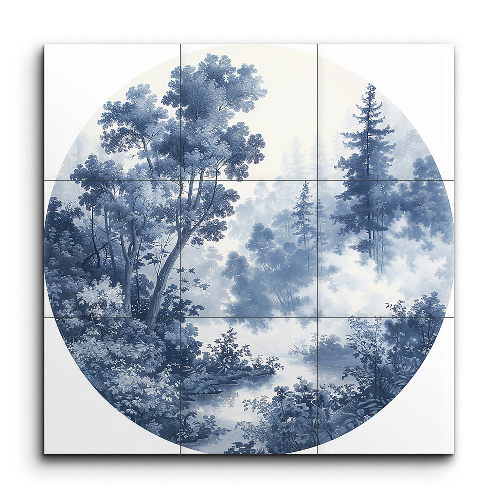 Immerse yourself in the tranquil beauty of nature with this exquisite tile mural, featuring a serene forest scene encapsulated within a circular frame. Reminiscent of traditional Chinese landscape painting, the artwork employs a monochromatic palette of blues, evoking a sense of peace and tranquility. Delicate brushwork brings to life tall, slender trees with intricate foliage, creating depth and layering. A subtle path or stream invites exploration, enhancing the calm and reflective mood of this ethereal masterpiece.