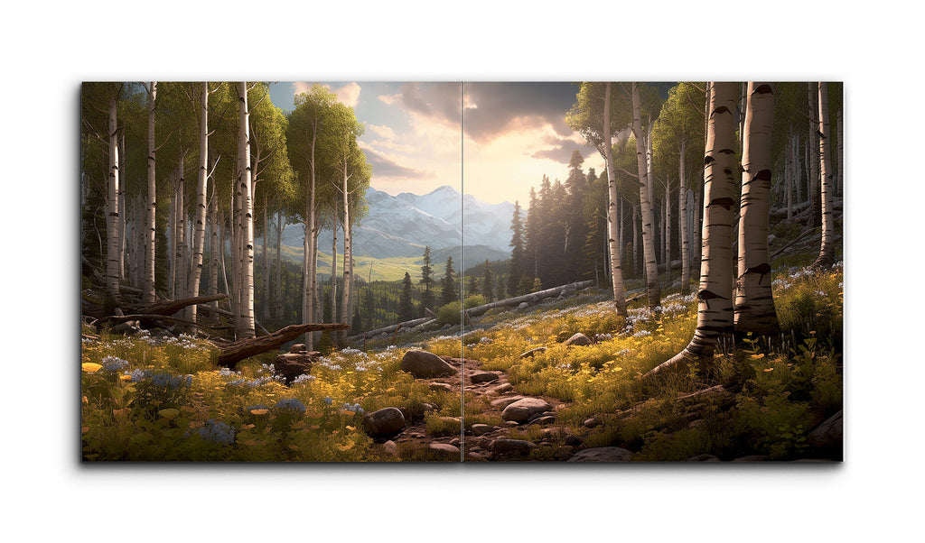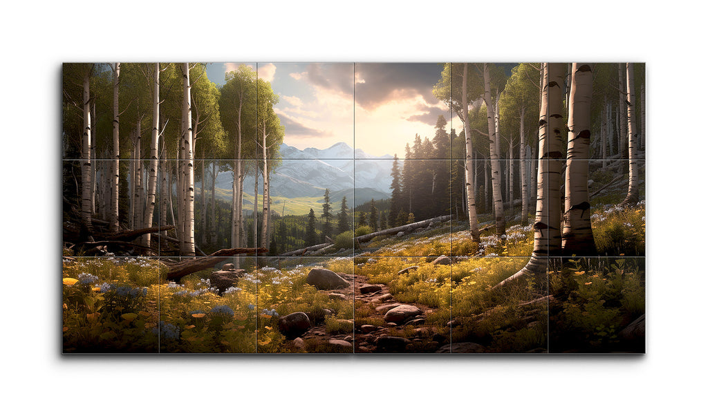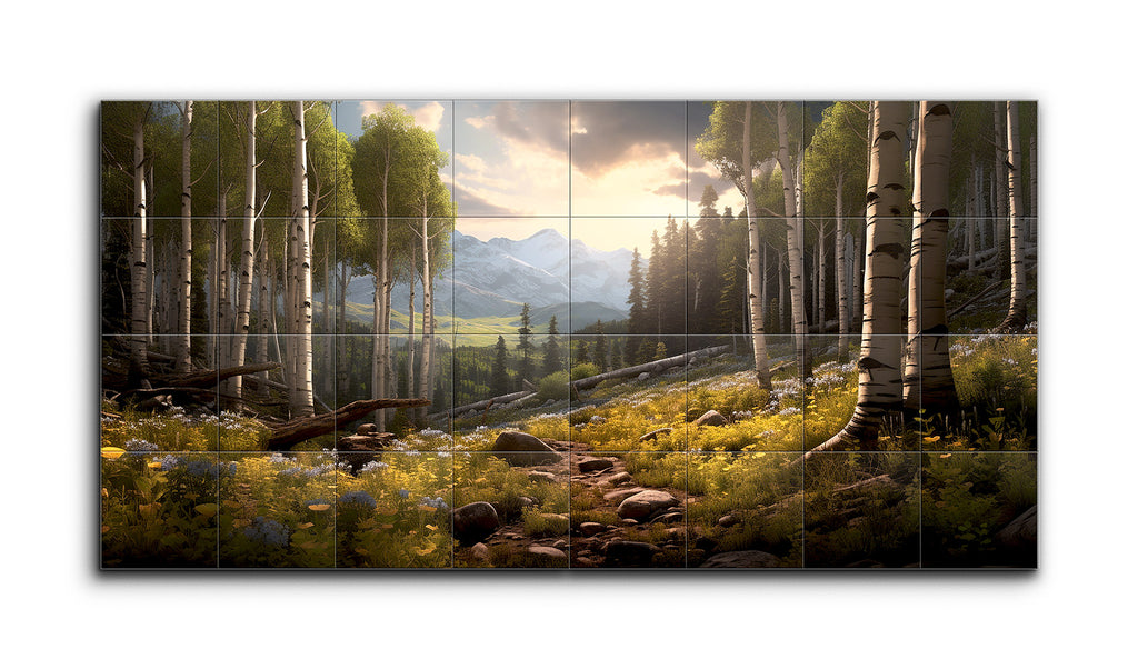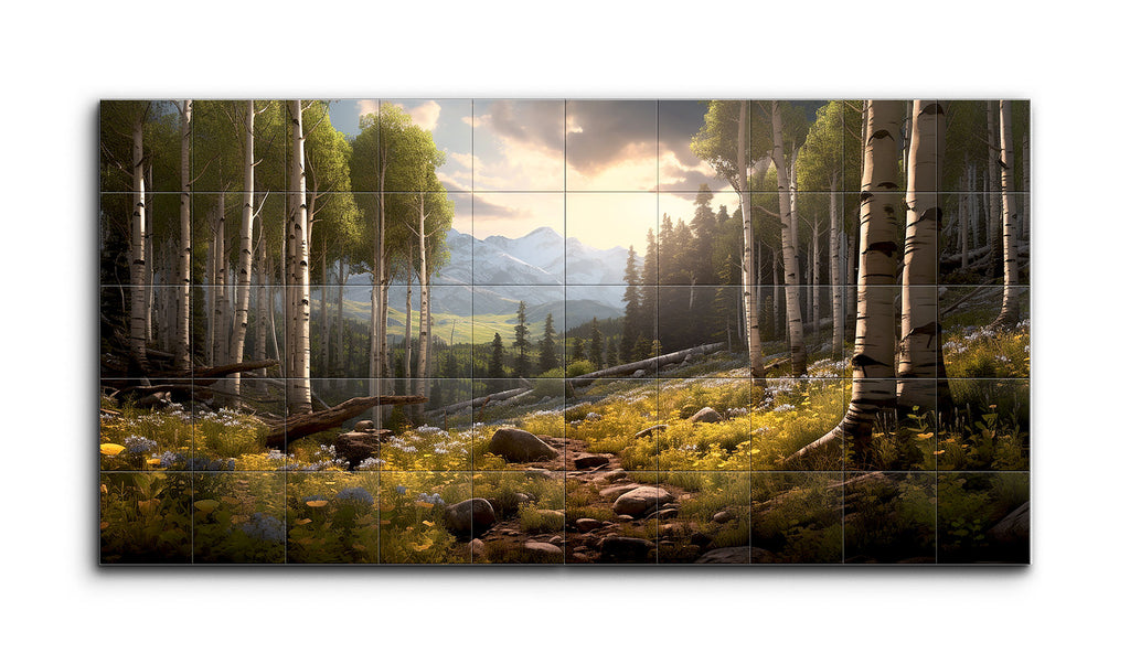 This tile mural showcases a serene forest clearing teeming with vibrant yellow wildflowers, lush green foliage, and scattered rocks. A meandering path leads through tall birch trees, their white bark and dark lacing illuminated by soft sunlight. A fallen tree trunk bridges the path, adding a touch of age and natural change. In the distance, rolling hills and a distant mountain range are bathed in soft blue and purple hues. The sky, dynamic with a low sun, casts a warm, golden light, creating a peaceful, otherworldly atmosphere.