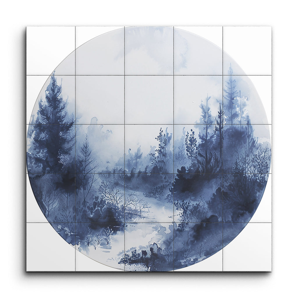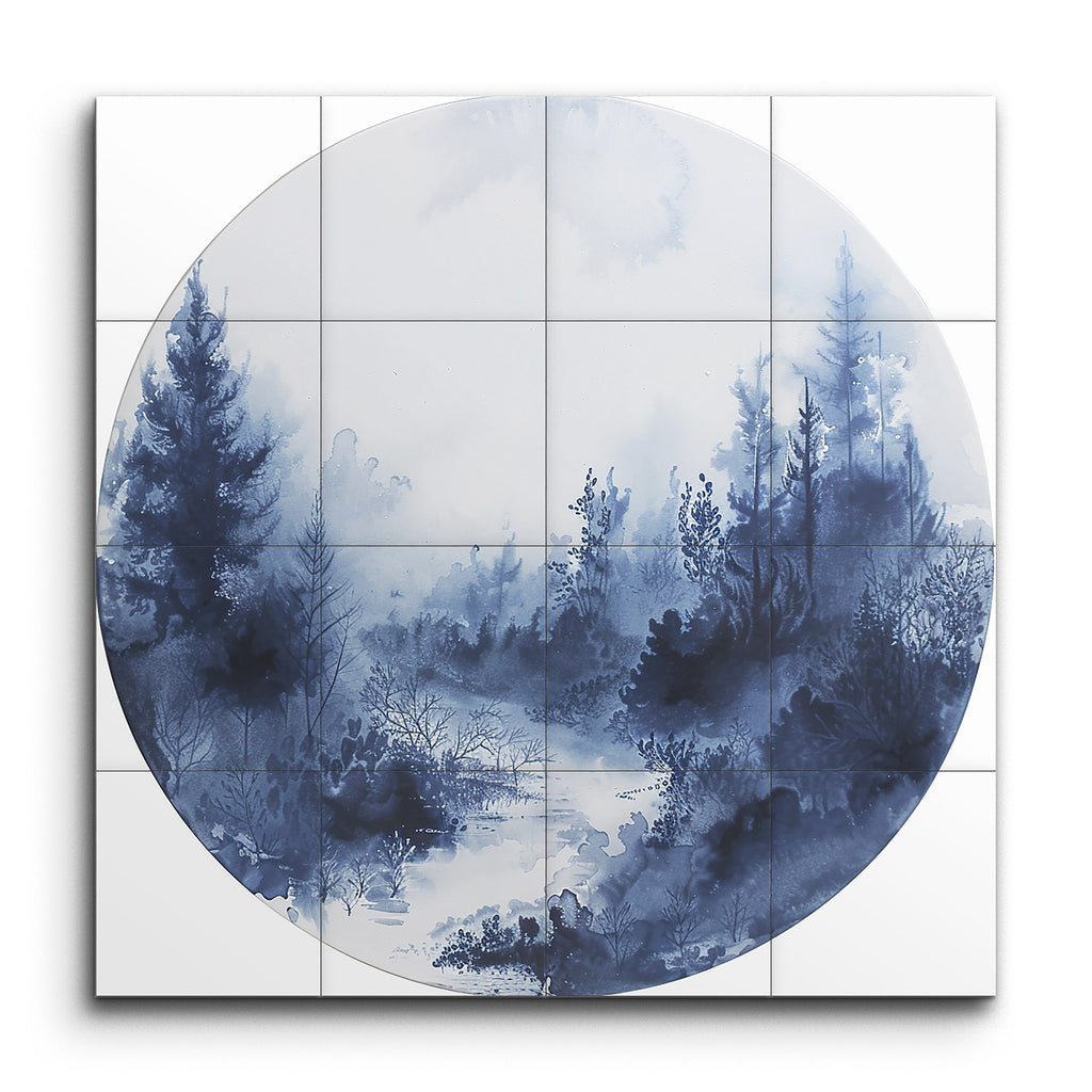 Immerse yourself in the tranquil beauty of this serene forest landscape, captured within a circular frame. Rendered in soft blues and grays, the monochromatic palette lends an ethereal quality to the scene. Delicate brushstrokes suggest dense clusters of trees and bushes in the foreground, while a meandering path or stream guides the eye into the misty, atmospheric background. This impressionistic artwork, with its dreamlike blending of colors, invites you to lose yourself in its peaceful, contemplative essence.