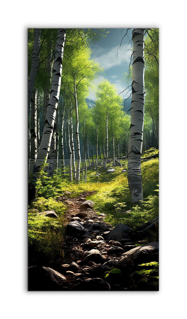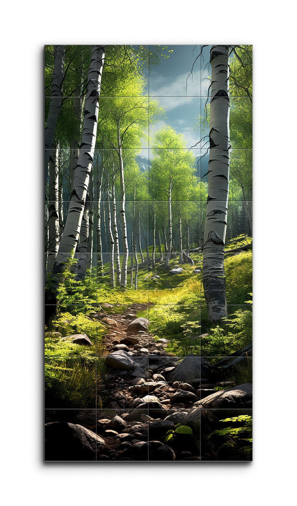 This tile mural showcases a serene forest scene with a winding, rocky path that invites exploration. Dominated by tall birch trees with striking white bark, the lush greenery sets a vibrant, realistic backdrop. The detailed depiction of foliage and stones enhances the depth, while the misty distance adds a dreamy quality. Natural light filters through the canopy, creating dynamic shadows and highlighting textures, capturing the peaceful beauty and tranquility of a forest in early summer.