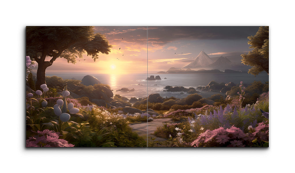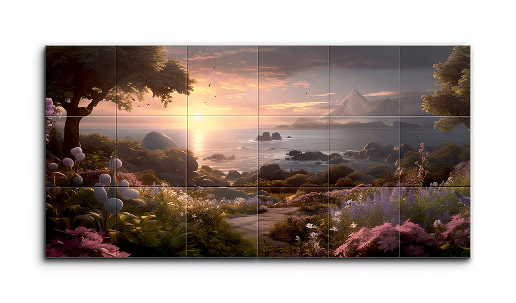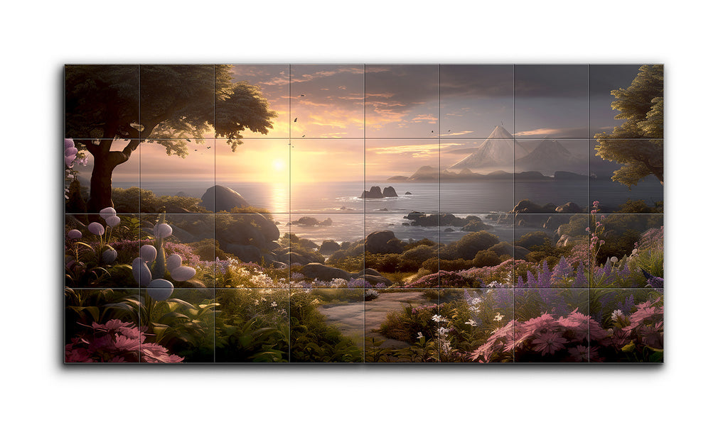 This tile mural presents a serene landscape in a diptych format, featuring a lush garden in the foreground with vibrant flowers in shades of pink, purple, and green. The garden seamlessly transitions into a rocky shore leading to a calm sea, reflecting the golden hues of a low-horizon sun. The background showcases mist-shrouded mountains rising from the sea under a gradient sky of yellow, purple, and blue. The artwork blends realism and romanticism, creating a peaceful, awe-inspiring scene.