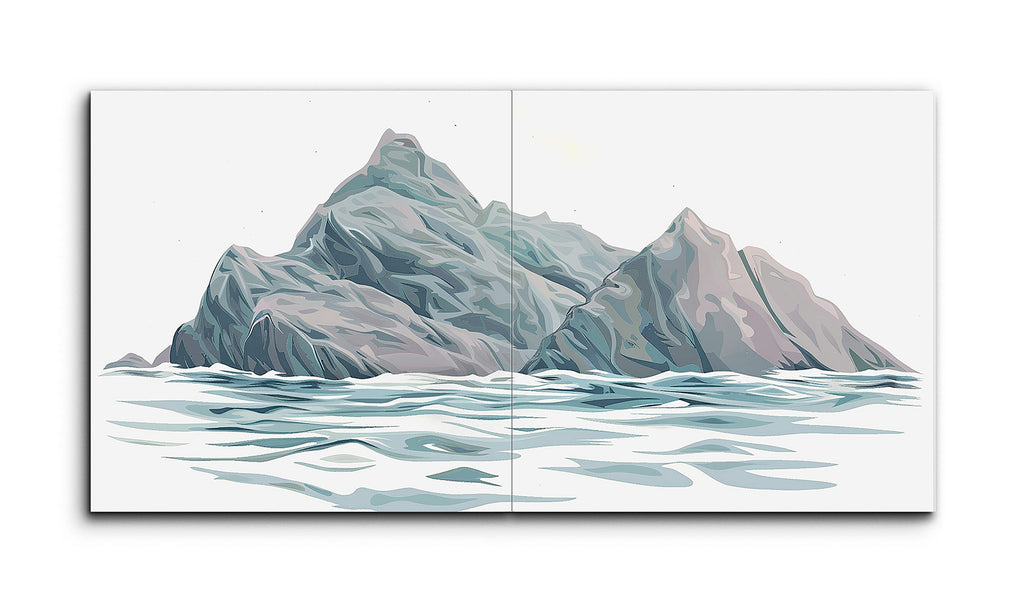 This tile mural presents a stylized mountainous landscape, divided into two panels forming a cohesive diptych. The scene features a rugged mountain rising from a serene body of water, rendered with geometric shapes and flowing lines. The limited color palette of blues, greens, grays, and hints of pink creates depth and dimensionality. The minimalist approach, focusing on the interplay of color and form, evokes a sense of calm and majesty, inviting personal interpretation and imaginative engagement.