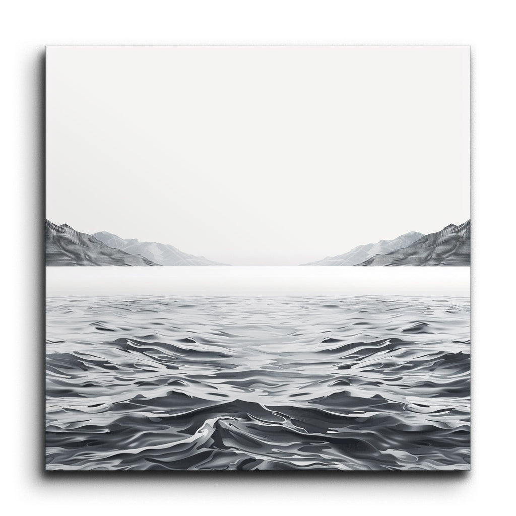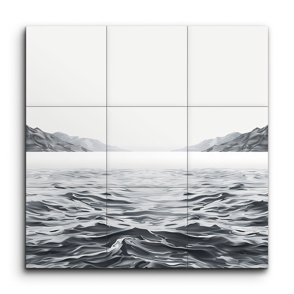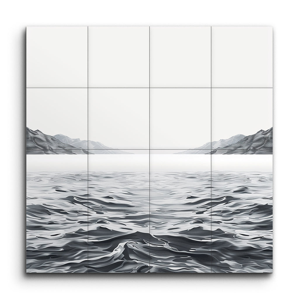 Transform your space with this captivating tile mural, showcasing a serene and expansive seascape in grayscale. The foreground's intricately detailed waves, with their dynamic crests and troughs, create a mesmerizing sense of movement. In contrast, the misty mountains in the background gently fade into the horizon, adding depth and tranquility. This minimalist, modern artwork emphasizes form and texture, inviting you to lose yourself in its calming, monochromatic beauty.