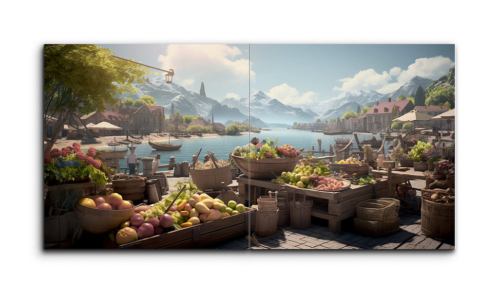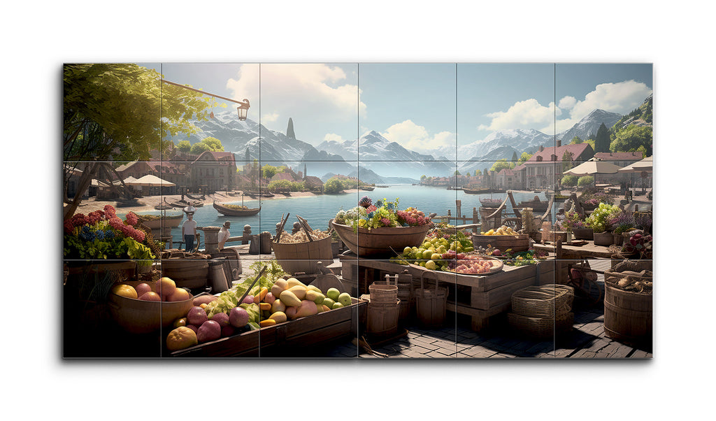 This tile mural captures a serene harbor scene reminiscent of a Mediterranean or European coastal town. The panoramic view is split into two panels, featuring a vibrant market in the foreground with meticulously arranged fresh produce in wooden crates and baskets. The middle ground showcases a charming cobblestone promenade leading to quaint buildings with terracotta roofs, including a church spire. Calm waters with moored boats and distant hazy blue mountains frame the background, all under a sunny, clear sky. The realistic yet idealized style highlights the beauty and harmony of this tranquil setting.