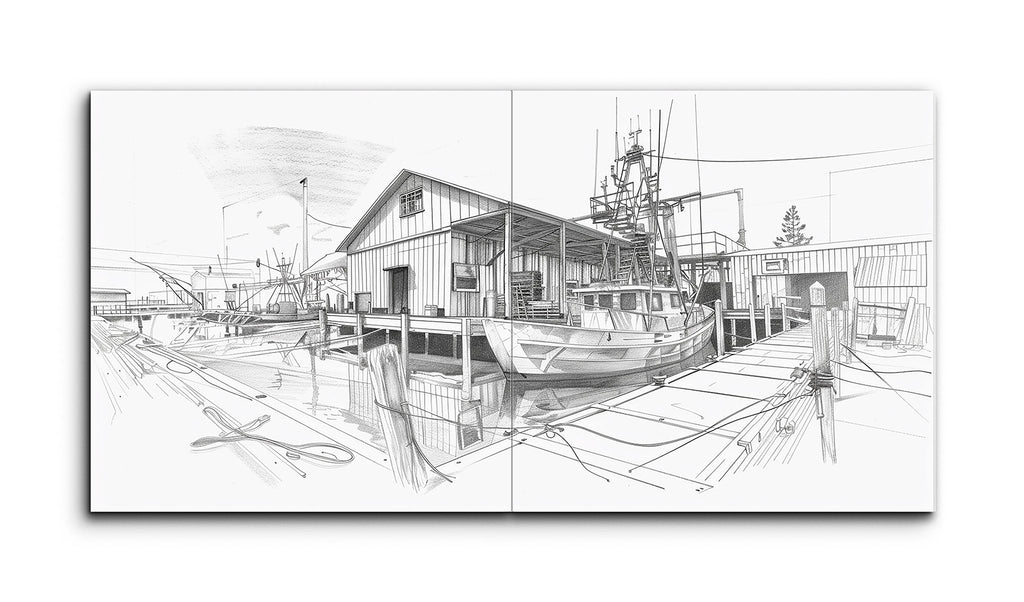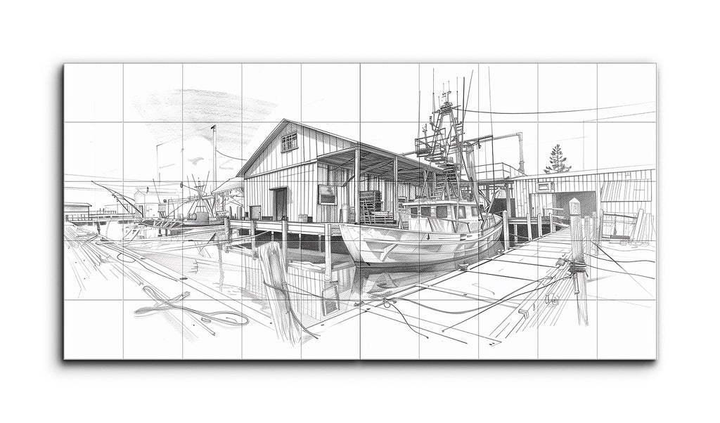 This tile mural features a detailed pencil sketch of a serene harbor scene. At the center is a wooden dock with a moored fishing boat, intricately rendered with ropes, railings, and fishing equipment. To the side stands a large building with a pitched roof, likely a boathouse or warehouse, depicted with precise lines for a realistic effect. Reflections in the calm water add depth, while lighter background elements create a sense of distance. The realistic style, with fine details and accurate proportions, conveys a tranquil, picturesque setting.