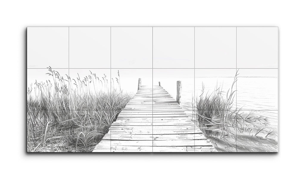 This tile mural captures a serene scene of a weathered wooden pier extending into a calm body of water. The pier, detailed with fine lines and shading, leads the eye towards the horizon. Tall, slender reeds and grasses frame the scene, adding an organic touch. Rendered in monochromatic shades of gray, the artwork exudes a timeless, ethereal quality. The tranquil water, with subtle ripples, suggests a gentle breeze, creating an atmosphere of peacefulness and quiet reflection.