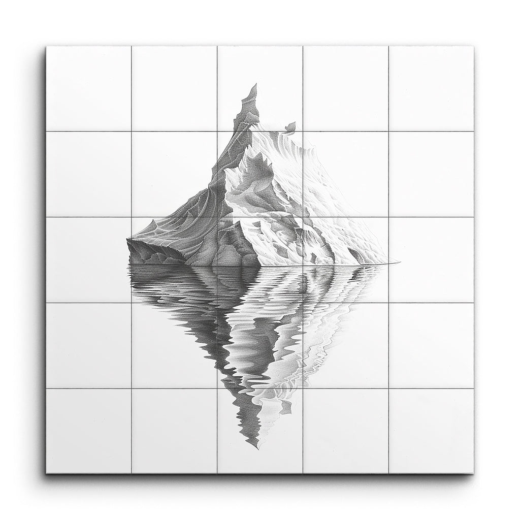 Immerse your space in serene beauty with our tile mural featuring a captivating stylized iceberg. Intricate, wavy lines create texture and depth, while the mirrored reflection in the water offers a slightly distorted, ethereal counterpart. This minimalistic composition emphasizes the contrast between solid form and fluid reflection, with fine, detailed line work and monochromatic shading. The piece blends realism and abstract line artistry, evoking a visually striking and contemplative atmosphere.