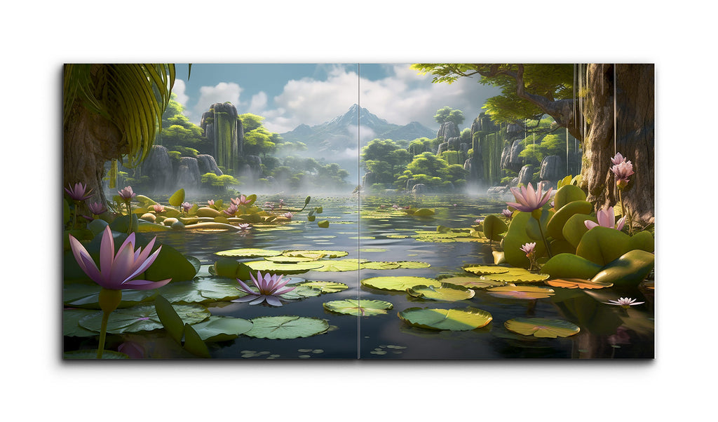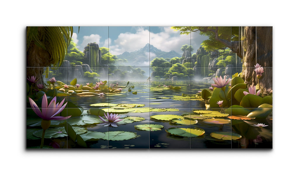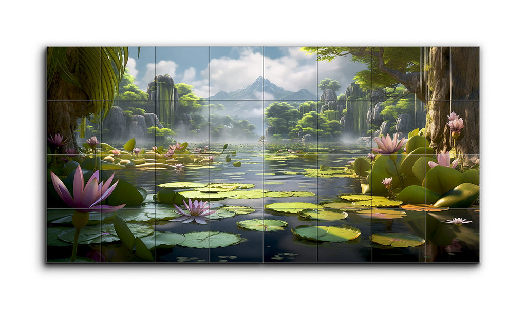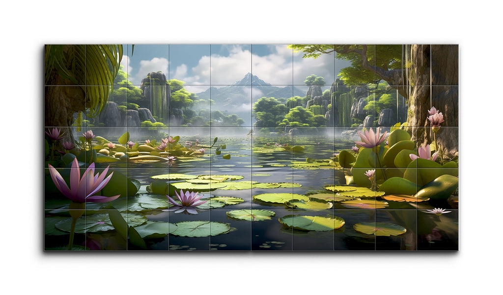 This tile mural presents a serene, idyllic landscape, capturing a tranquil scene of nature at its finest. In the foreground, a calm water body is adorned with large green lily pads and blooming pink and white water lilies, reflecting the sky and surrounding foliage. The middle ground reveals a lush, verdant jungle with detailed trees and plants, leading to majestic rock formations in the background. The scene culminates with a distant, sharp, snow-capped mountain under a bright sky, exuding peace and perfection.
