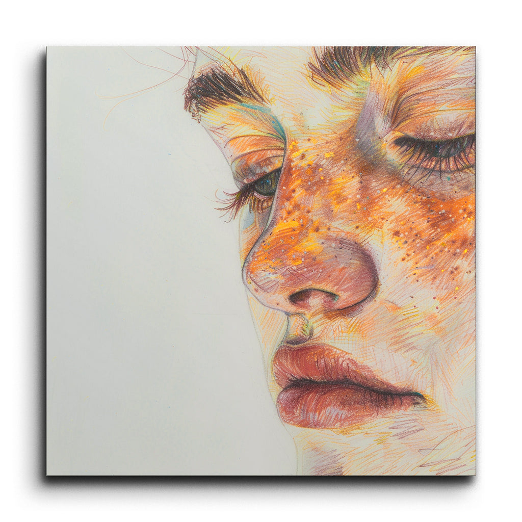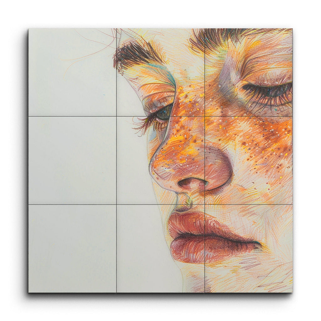 Experience the captivating intimacy of our tile mural, featuring a masterfully detailed close-up of a person's face. This artwork radiates realism with its rich interplay of warm and cool hues, meticulously rendered freckles, and delicate eyelashes. The closed eyes and softly parted lips evoke a serene moment of introspection. The intricate detailing, from the fine lines on the skin to the textured hair, creates a lifelike and deeply personal portrayal, inviting quiet reflection and appreciation of true artistry.