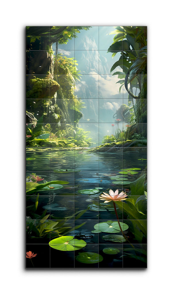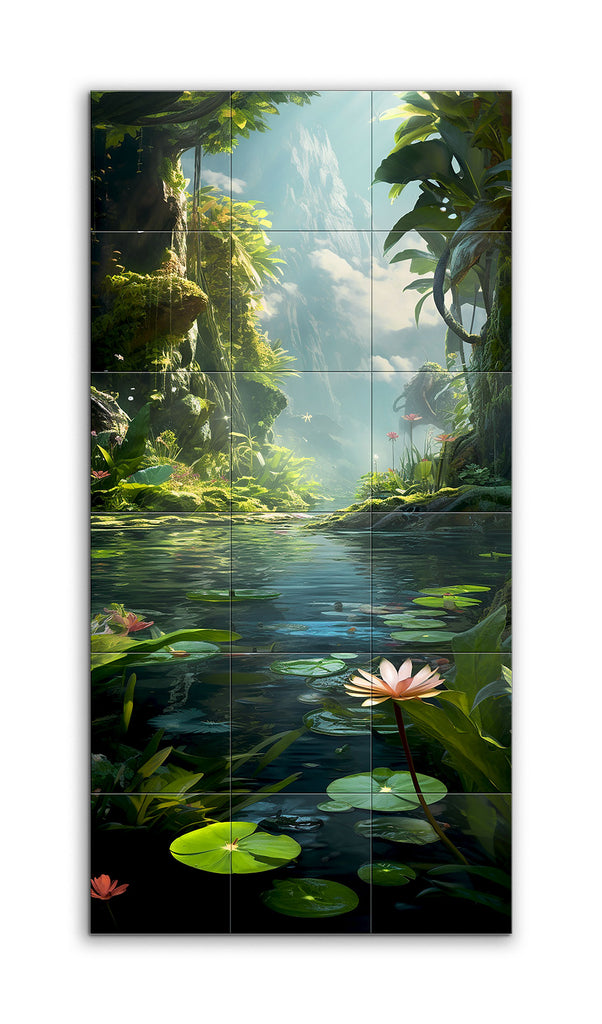 This tile mural showcases a serene jungle scene centered around a tranquil pond. Calm waters reflect lush greenery and a partly cloudy sky. A vibrant pink water lily with broad green lily pads graces the foreground. Dense foliage with varied plants, hanging vines, and mosses lines the water's edge, evoking a humid, tropical atmosphere. In the background, mist-covered mountains rise majestically, bathed in soft, diffused light, creating a peaceful and almost magical landscape. The artwork is highly detailed and realistic, emphasizing natural textures and a tranquil ambiance.