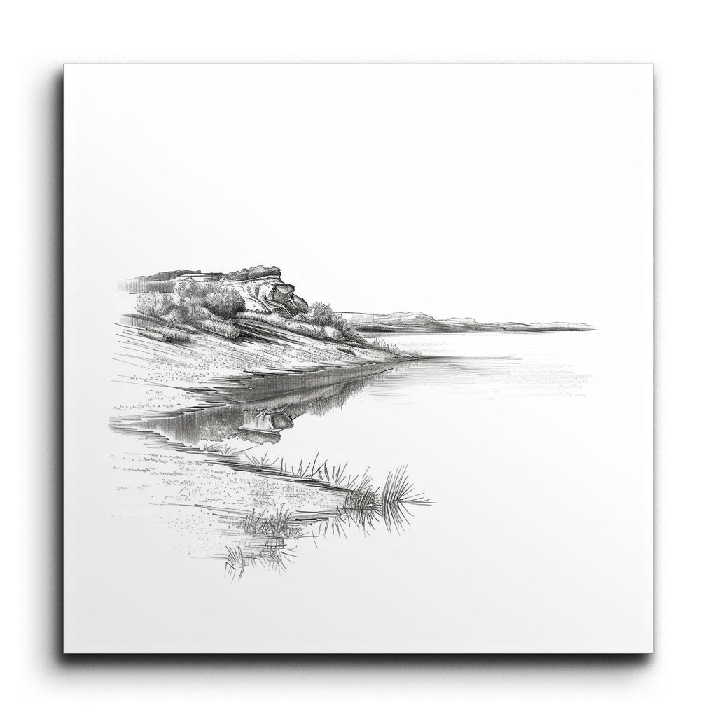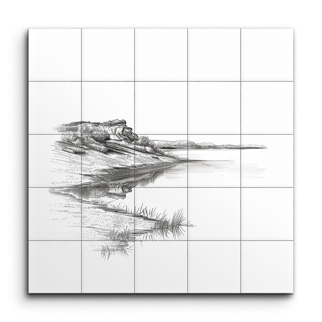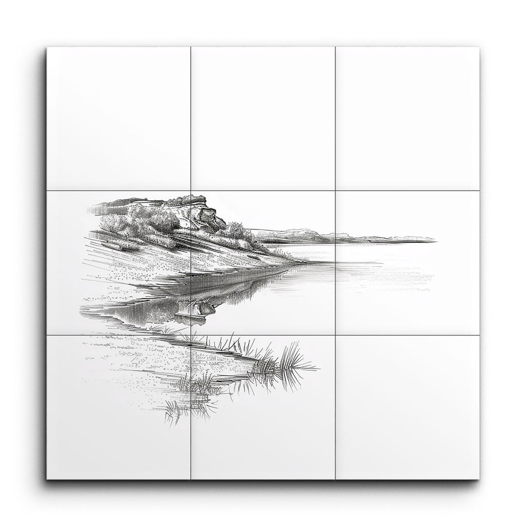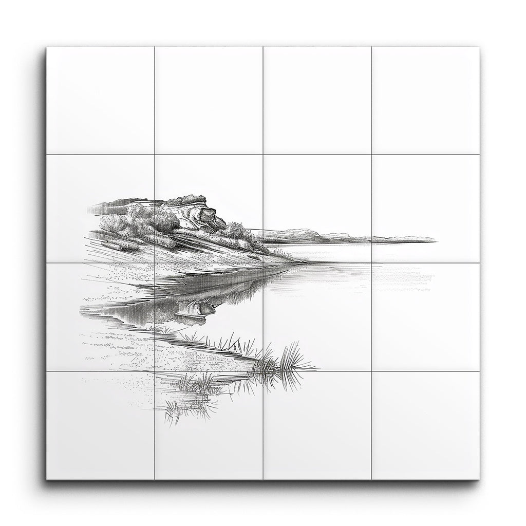 Immerse yourself in the tranquil beauty of nature with this minimalist black and white tile mural. The serene lakeside scene captures a calm body of water, reflecting the surrounding landscape with delicate, horizontal lines. On the left, a rocky outcrop adorned with grasses and small bushes extends into the water, while the faint horizon on the right evokes a sense of vastness and peace. The clean, precise lines and subtle shading bring depth and elegance to this peaceful, natural masterpiece.