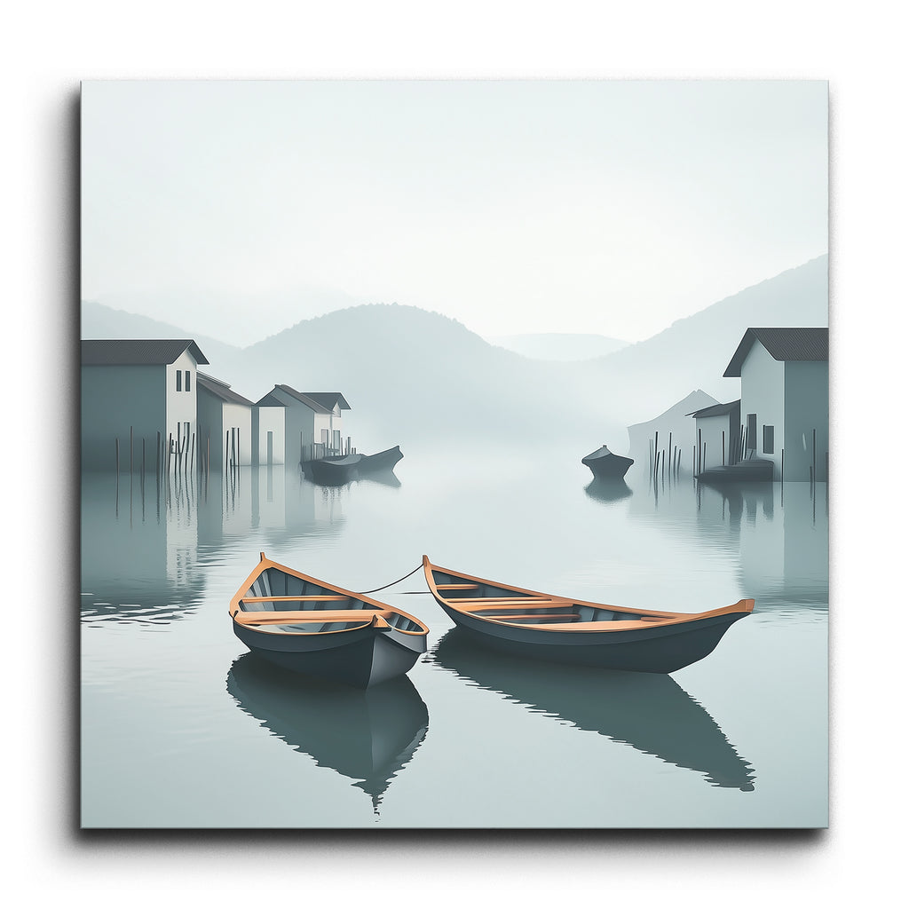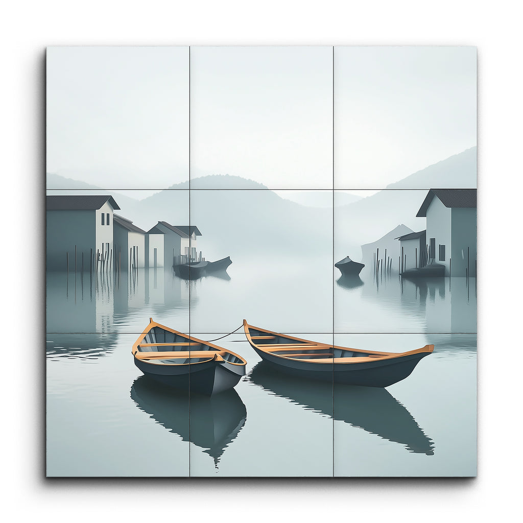 This tile mural captures a serene lakeside scene with a minimalist and tranquil aesthetic. Two wooden boats float gently on calm waters, their reflections mirrored perfectly. Stilt houses with clean lines and muted colors dot the water's edge, blending seamlessly into the soft blues and greys of the landscape. In the distance, softly rendered mountains add depth and an ethereal quality, enhancing the peaceful ambiance. Light and shadow are used subtly, creating an overall effect of quiet reflection and tranquility.
