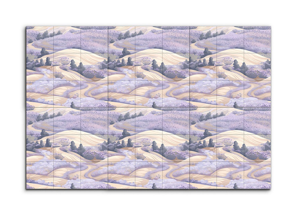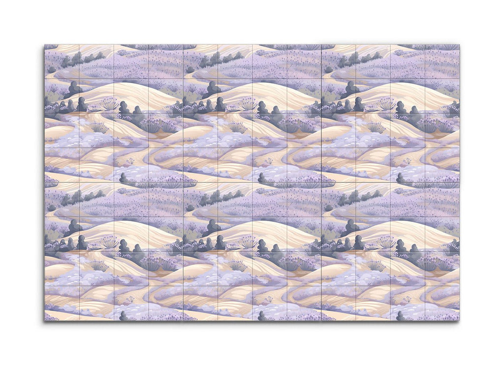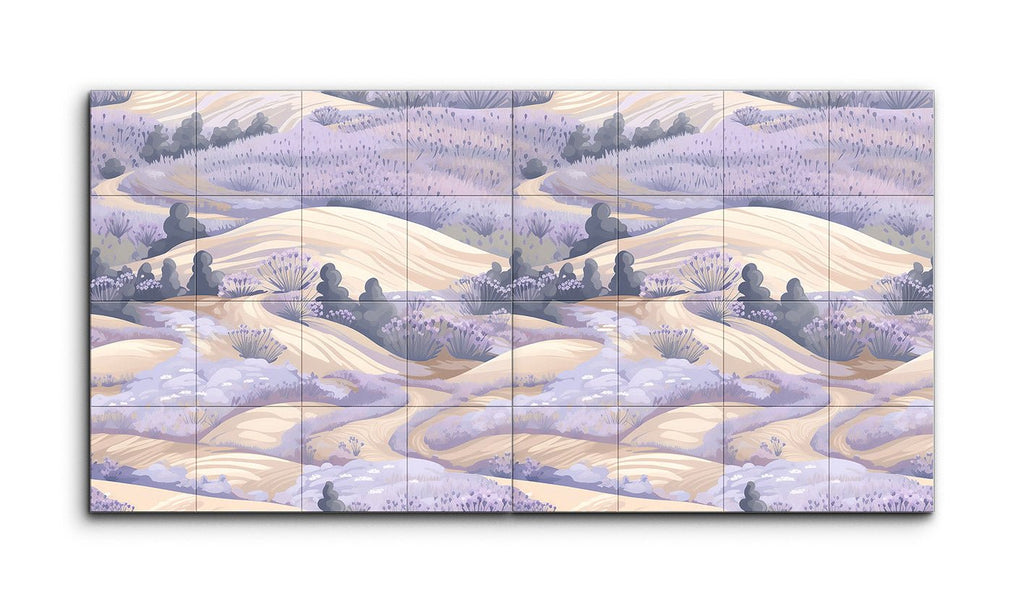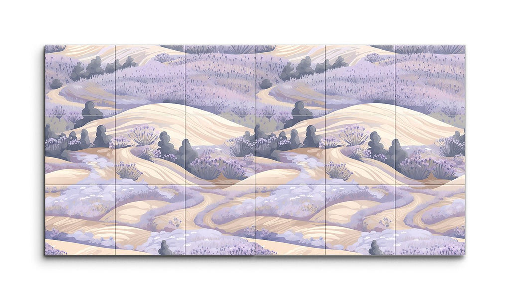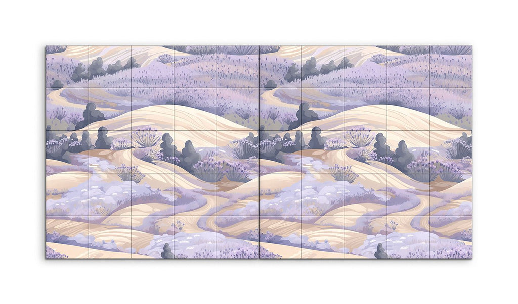 Transform your space with our captivating tile mural featuring a serene landscape of rolling hills and winding paths. The artwork, rendered in soft pastels of lavender, purple, and beige, exudes calm and tranquility. Gentle contours and flowing lines create a sense of movement, while stylized vegetation in shades of purple and gray adds harmony. This minimalistic yet detailed piece invites you to immerse yourself in its quiet beauty, offering a peaceful escape right within your home.