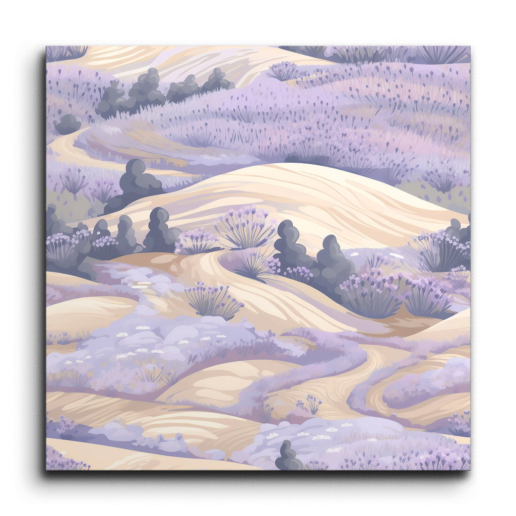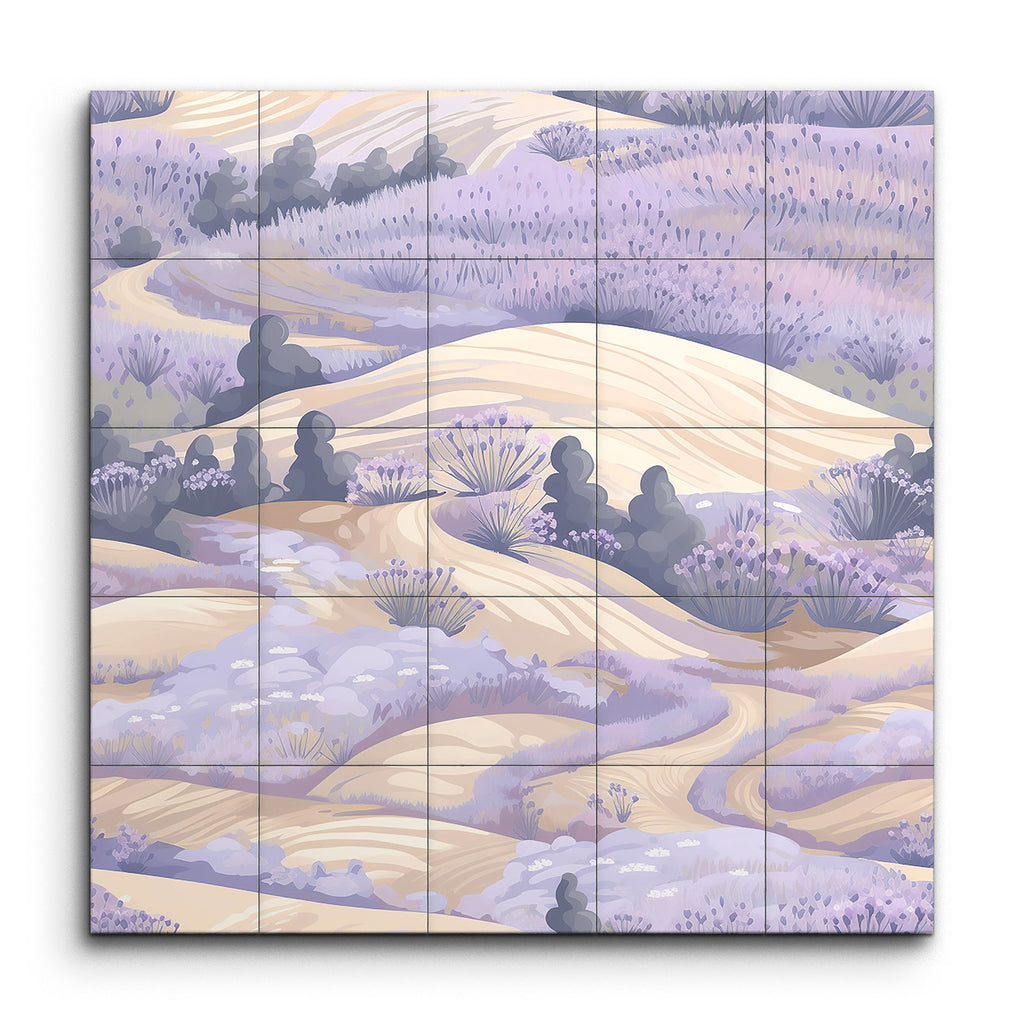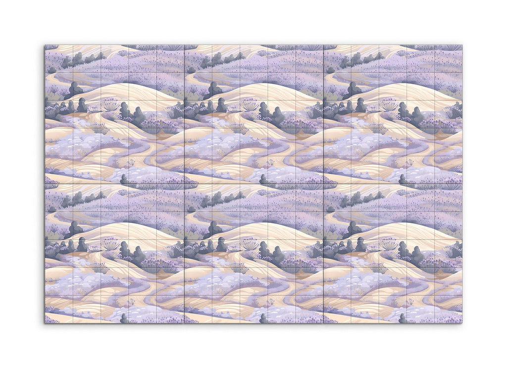 Transform your space with our captivating tile mural featuring a serene landscape of rolling hills and winding paths. The artwork, rendered in soft pastels of lavender, purple, and beige, exudes calm and tranquility. Gentle contours and flowing lines create a sense of movement, while stylized vegetation in shades of purple and gray adds harmony. This minimalistic yet detailed piece invites you to immerse yourself in its quiet beauty, offering a peaceful escape right within your home.