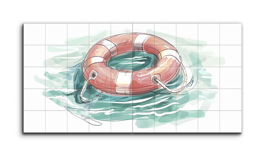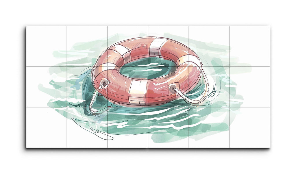 This tile mural features a lifebuoy floating on serene waters. The lifebuoy, with its red and white stripes and attached ropes, appears almost three-dimensional due to skillful use of light and shadow. The water, depicted in shades of blue and green with expressive brush strokes and color blending, suggests gentle movement with white highlights reflecting light. The lifebuoy's detailed rendering and warm colors contrast beautifully against the cooler water tones, evoking feelings of tranquility and safety.