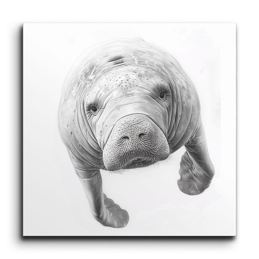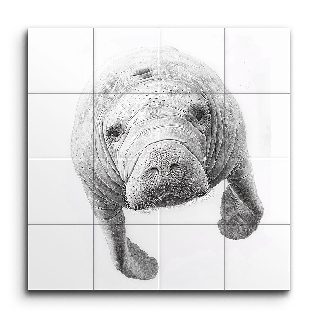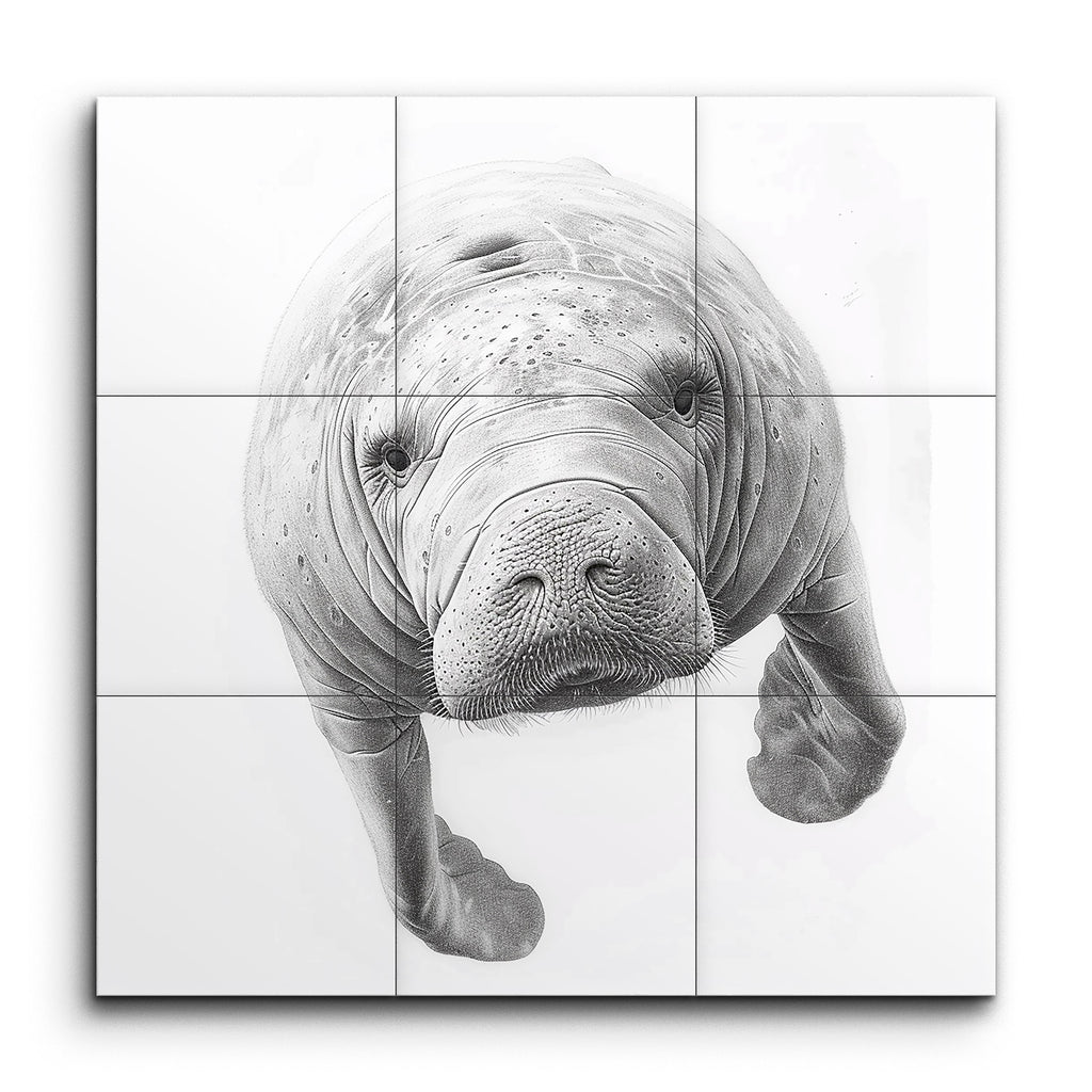 Immerse yourself in the serene beauty of marine life with our hyper-realistic manatee tile mural. This captivating artwork showcases a manatee in stunning detail, from its rough, wrinkled skin to its expressive eyes and whisker-like structures. The meticulous shading and fine lines create a three-dimensional effect, making the manatee appear as though it's emerging from the surface. The monochromatic palette of grays enhances the lifelike quality, allowing you to appreciate the intricate details of this gentle giant.