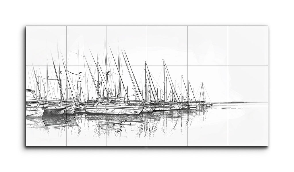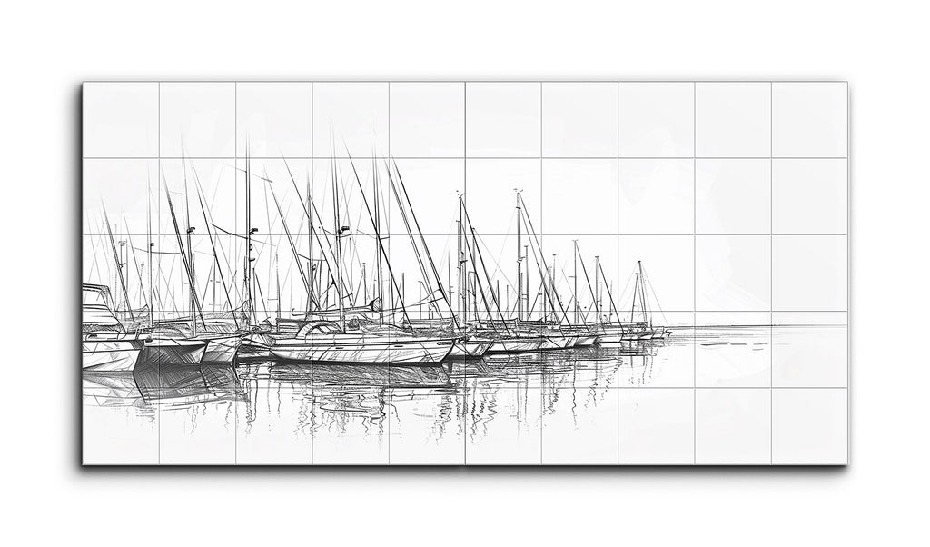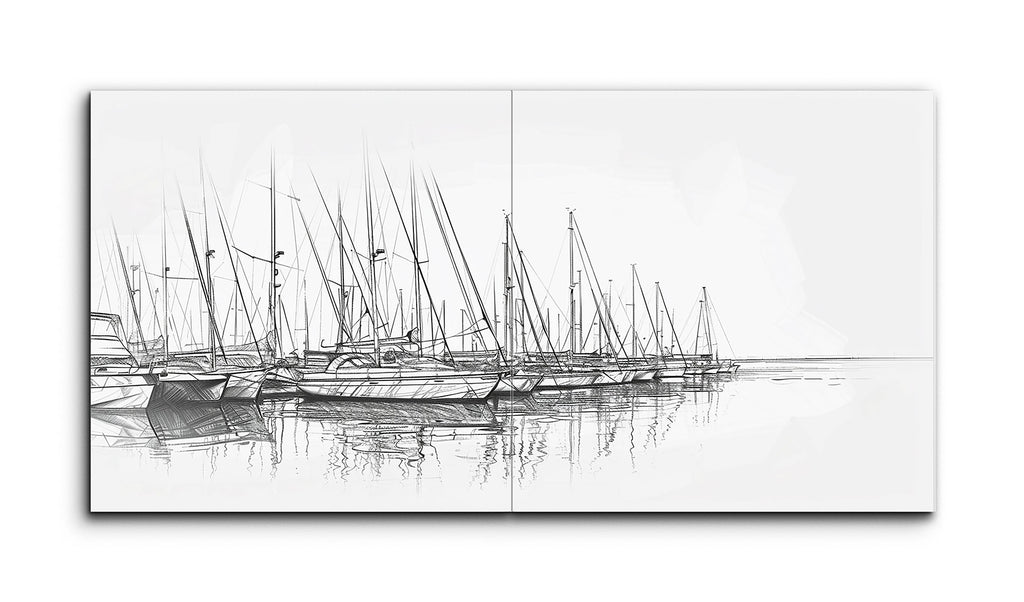 This two-panel tile mural, a minimalist diptych, showcases a monochromatic sketch of a serene marina filled with sailboats. Rendered with fine lines and cross-hatching techniques, the artwork highlights slender masts and detailed rigging, reflecting meticulous attention to the structures. Subtle horizontal strokes depict calm water, enhancing the tranquil mood. The simplicity and absence of color emphasize the elegant forms and peacefulness of the marina setting.