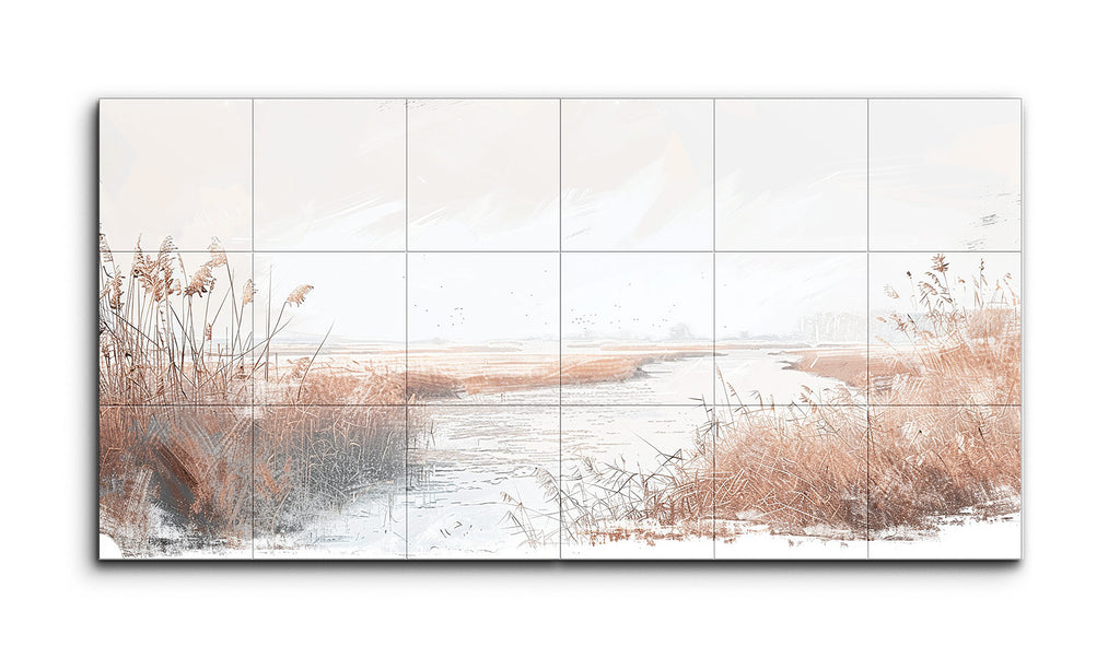 This diptych tile mural captures a serene landscape of a marsh or wetland, centered on tall grasses and reeds. The muted color palette features soft earth tones, beiges, browns, and pale blues, evoking a tranquil natural setting. The semi-abstract style, with loose and expressive brushwork, balances representation and abstraction, inviting personal interpretation. The composition creates depth, with a subtle horizon blending sky and water, enhancing the scene's calm, open feel. The two panels add to the sense of continuity and expansiveness.