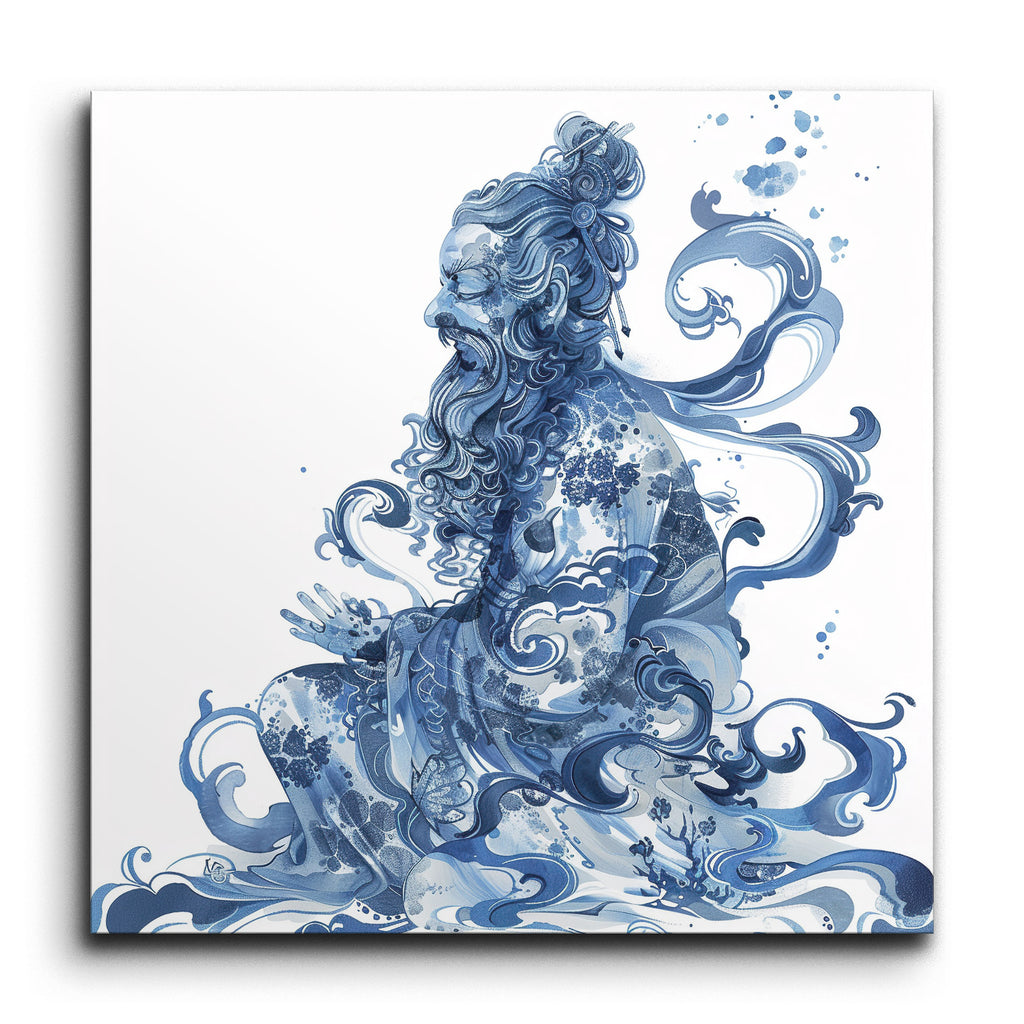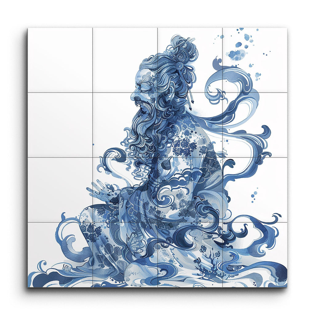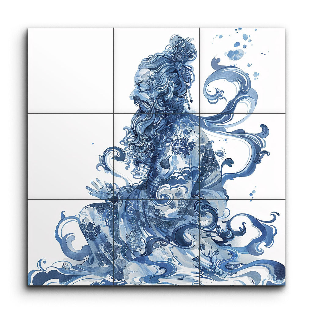 Immerse yourself in tranquility with this captivating tile mural, featuring a serene figure seated in deep meditation. Rendered in various shades of blue, the artwork exudes calm and introspection. Intricate lines and patterns flow seamlessly, blending the figure's elaborate hair and beard with wave-like elements, creating a harmonious, ethereal effect. Combining traditional illustration with modern design, this mural invites you to explore its serene, dynamic beauty and find peace in its intricate details.