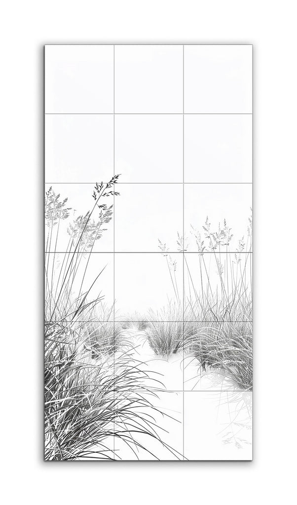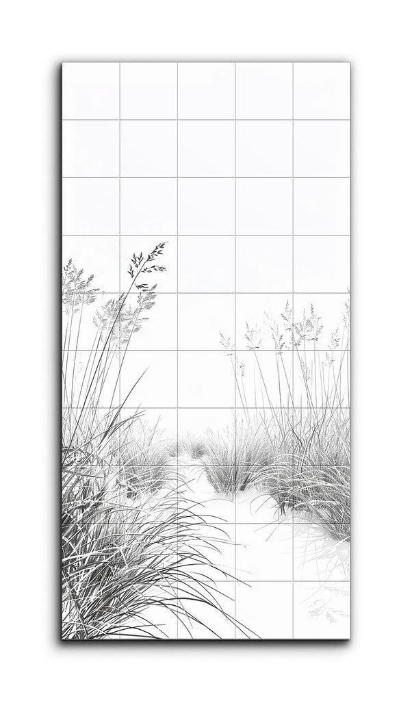 This tile mural features a serene, minimalist landscape of tall, slender grasses swaying gently. Rendered in monochromatic shades of black and white, the grasses are meticulously detailed with fine lines and delicate strokes that highlight their texture and movement. The composition conveys tranquility and simplicity, with negative space enhancing the sense of openness and calm. The clean, precise style focuses on line work and subtle shading, creating depth and dimension.
