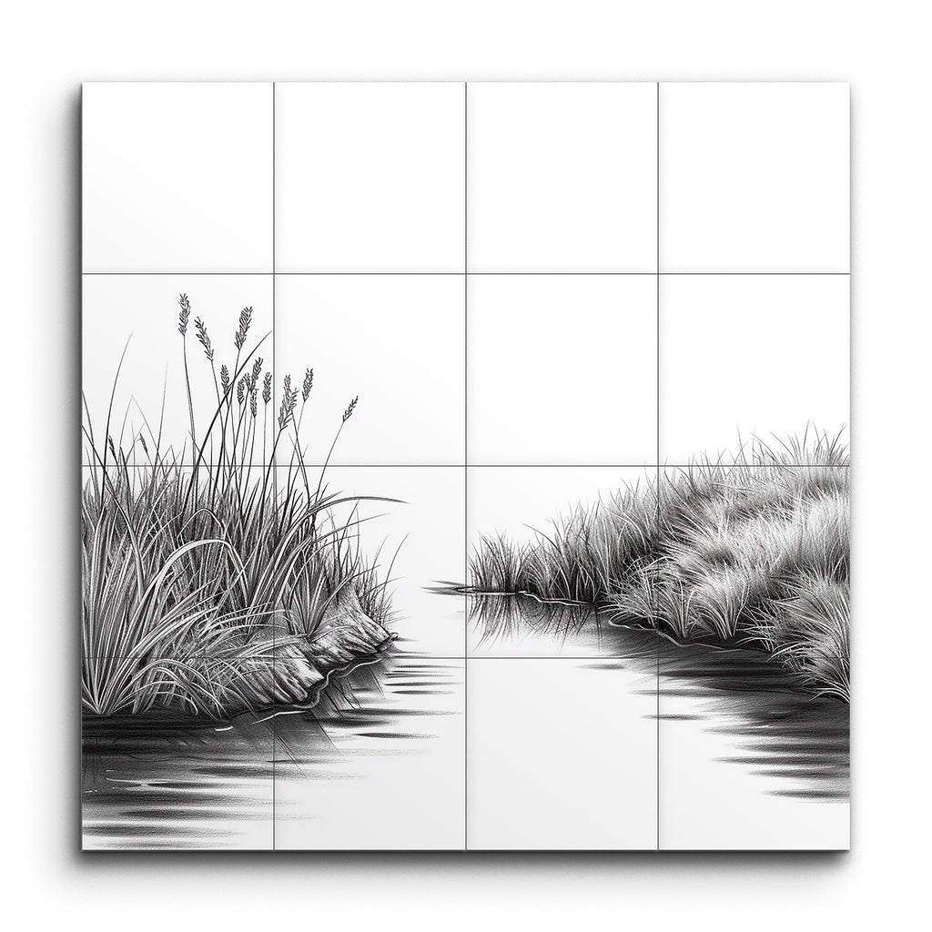 Transform your space with this exquisite tile mural, capturing the essence of a serene natural landscape. Rendered in a timeless monochromatic palette, the artwork showcases a tranquil body of water flanked by meticulously detailed tall grasses and reeds. The reflective water surface and lifelike vegetation create a harmonious balance, evoking a sense of calm and tranquility. This mural's classic, detailed style will add an elegant touch to any environment, inviting nature's serenity indoors.