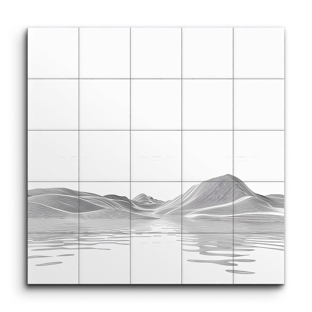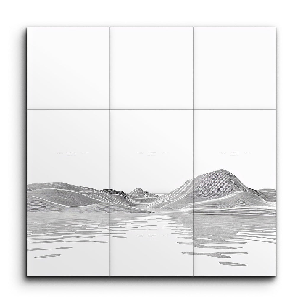 Immerse yourself in the serene beauty of our minimalist landscape tile mural. This captivating artwork features undulating hills and mountains in monochromatic shades of gray, creating a tranquil and balanced composition. A reflective body of water with gentle ripples mirrors the contours of the land, enhancing the peaceful ambiance. Clean lines and soft gradients evoke a sense of calm and introspection, making this piece a perfect addition to any contemplative space.