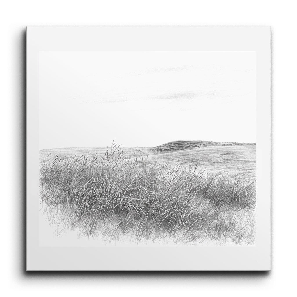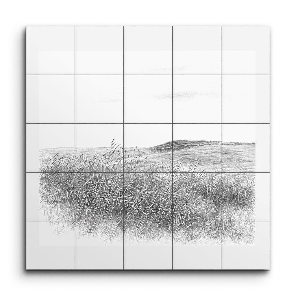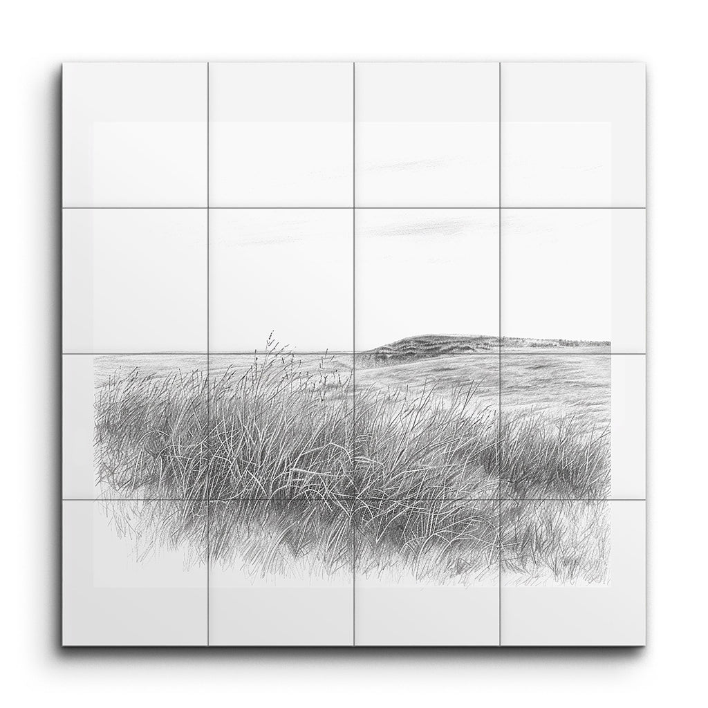 Transform your space with this serene tile mural, showcasing a minimalist, monochromatic landscape. Delicate, fine lines bring to life a grassy field leading to a distant, subtly shaded hill. The detailed strokes of the grass create a sense of movement, while the sparsely detailed sky suggests a gentle breeze. This artwork’s simplicity and precision evoke a calming, peaceful atmosphere, making it a perfect addition to any tranquil setting.