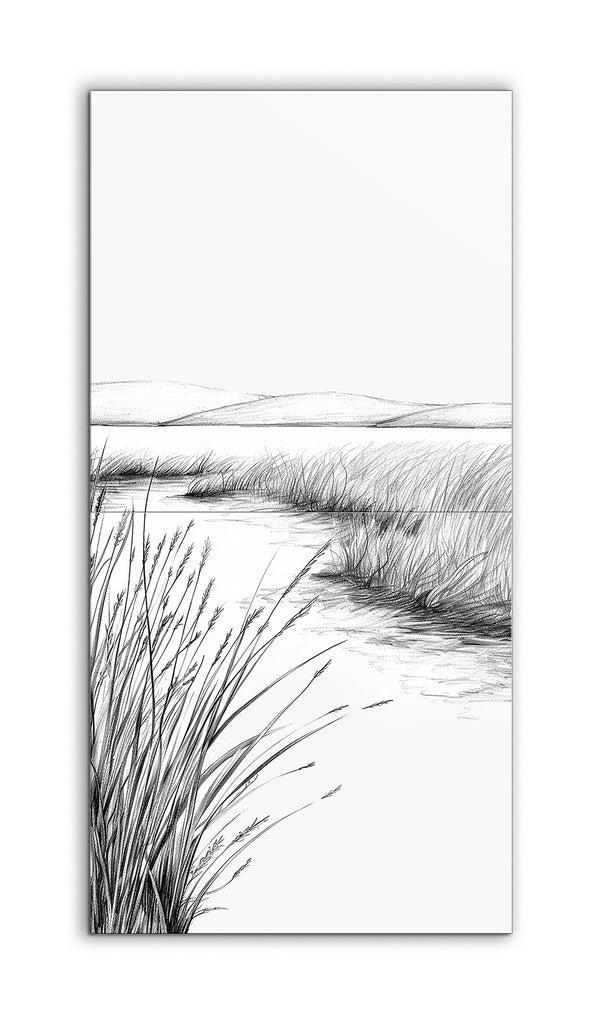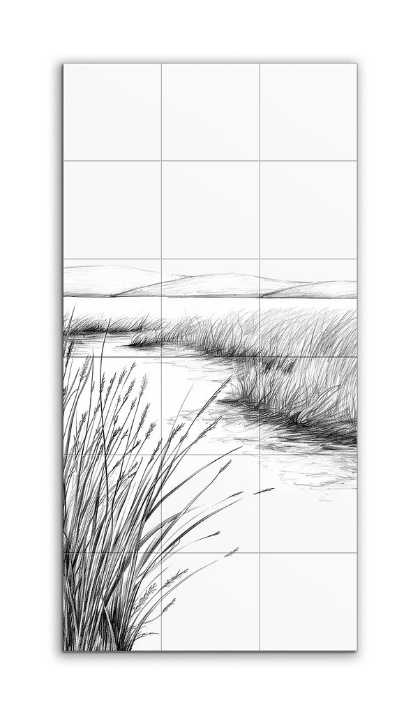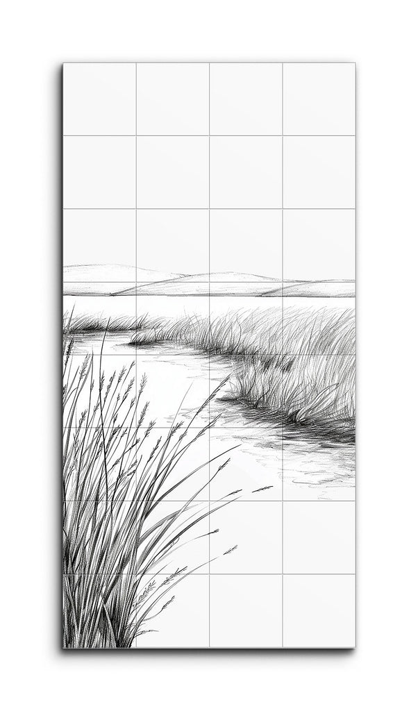 This monochromatic, black-and-white tile mural presents a serene natural landscape. A tranquil river or stream flows through the scene, bordered by tall, slender grasses and reeds intricately detailed with fine lines. Gentle, rolling hills in the background add depth and a sense of tranquility. The minimalist yet highly detailed line work emphasizes the elegance of the scene, with black ink on a white background highlighting the calm water and intricate grasses, creating a harmonious and peaceful composition.