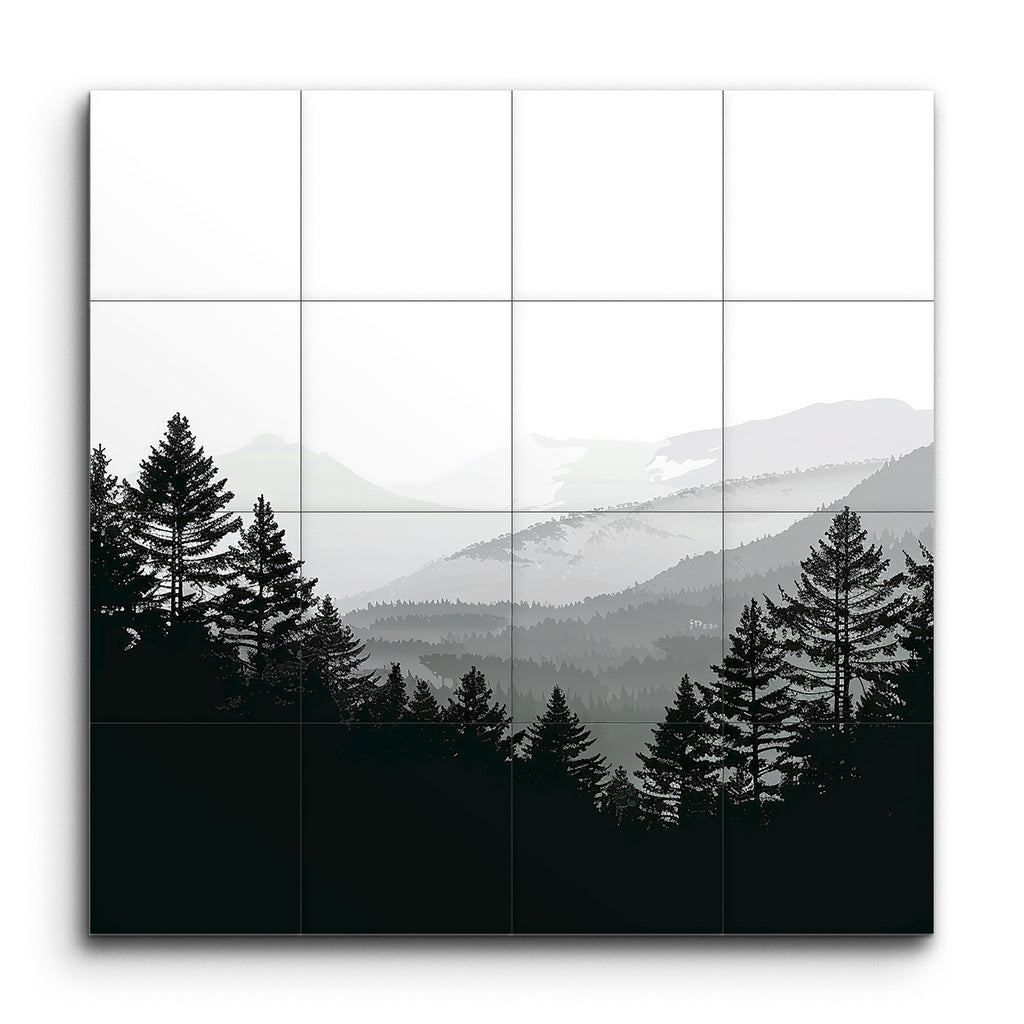 Transform your space with this captivating tile mural, showcasing a serene and minimalist landscape. The artwork features a series of mountain ranges and dense forests, rendered in monochromatic tones of black, gray, and white. The foreground is dominated by detailed silhouettes of tall evergreen trees, while the background mountains fade into a misty, ethereal sky. This harmonious composition, with its tranquil and contemplative mood, evokes a profound sense of calm and solitude in nature.
