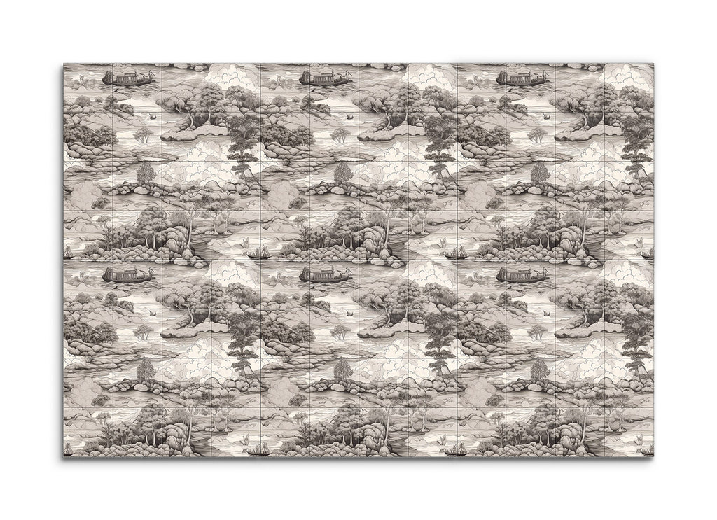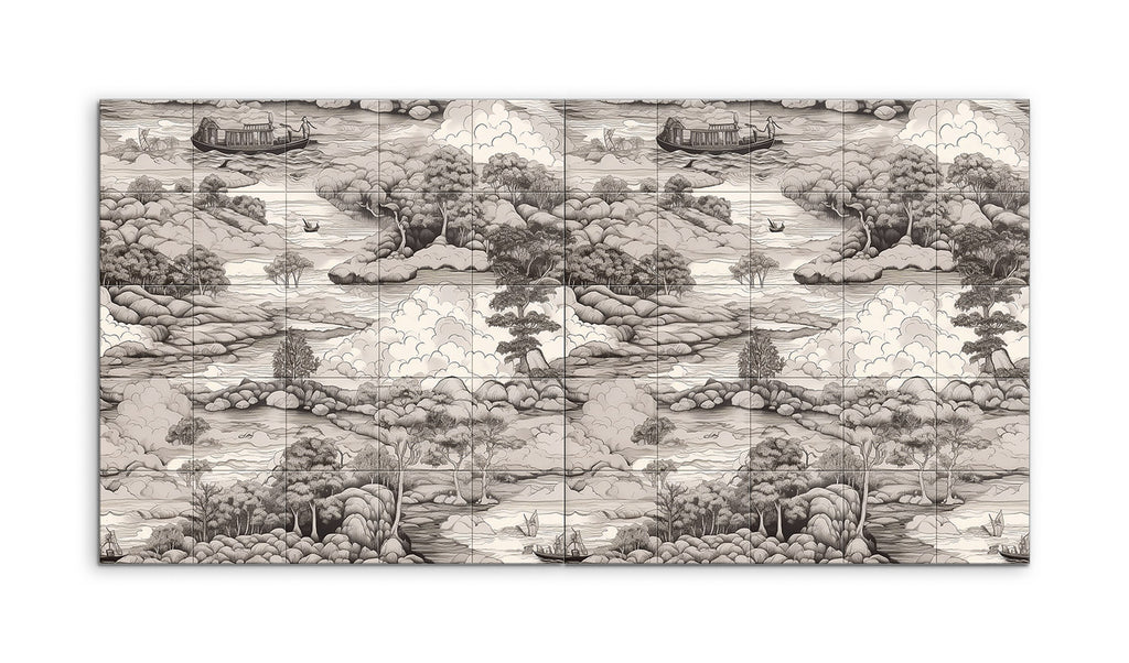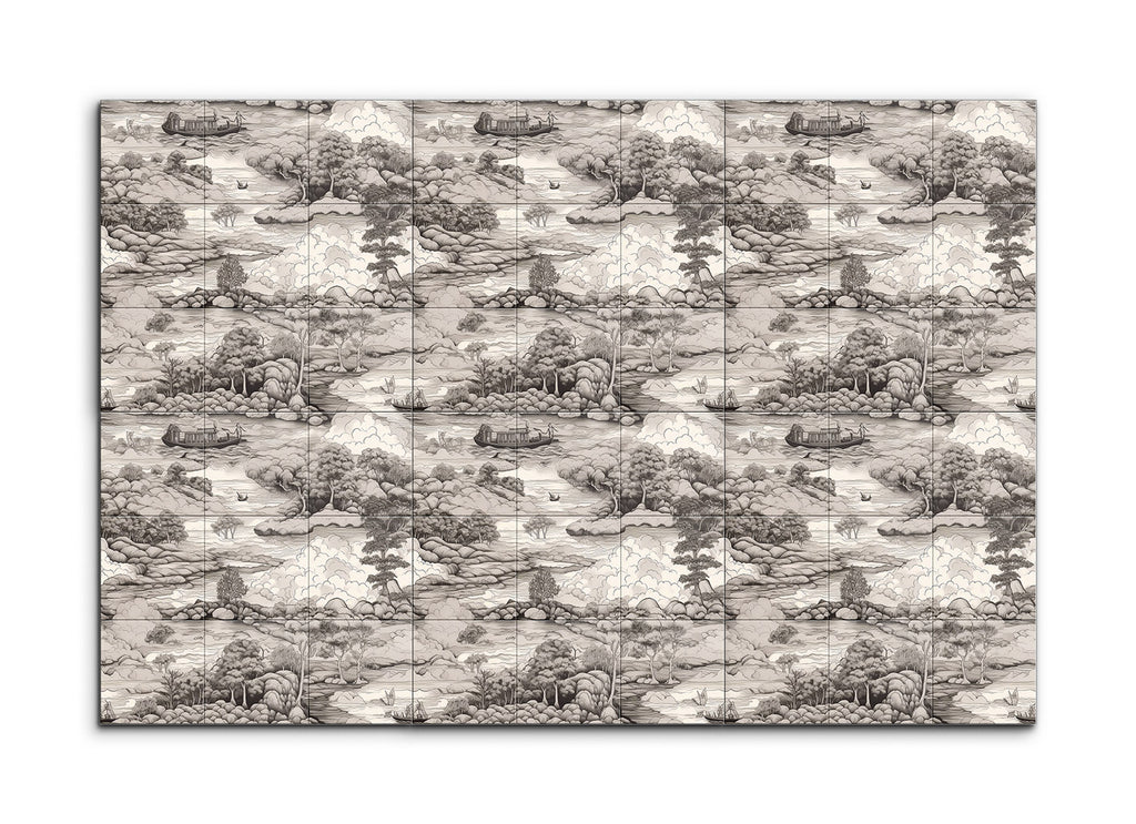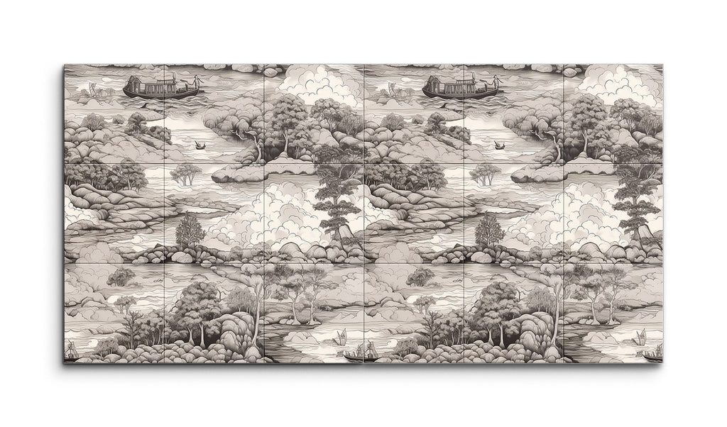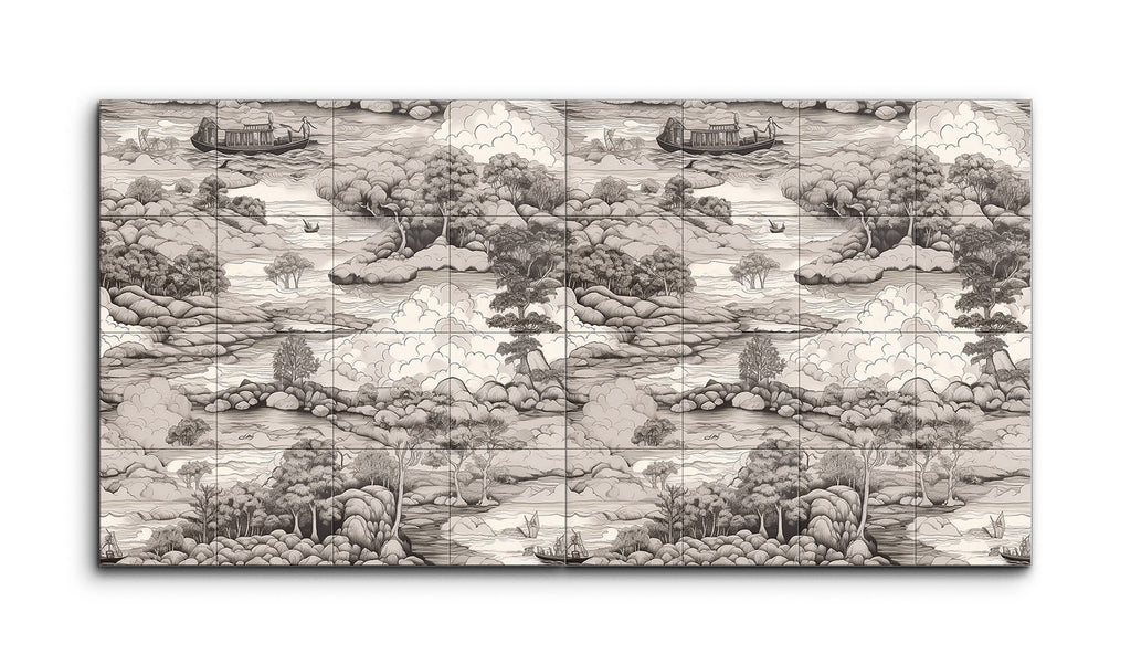 Immerse yourself in the tranquil beauty of this tile mural, depicting a serene monochromatic landscape. A winding river meanders through lush, hilly terrain, dotted with clusters of trees in varying textures. Small boats float gently on the river, while a larger houseboat adds a captivating focal point. The misty hills in the background and the billowing clouds merge seamlessly, evoking a sense of depth and peace. Inspired by traditional East Asian ink wash paintings, this artwork celebrates nature's serene beauty with meticulous detail.