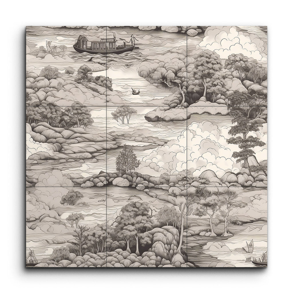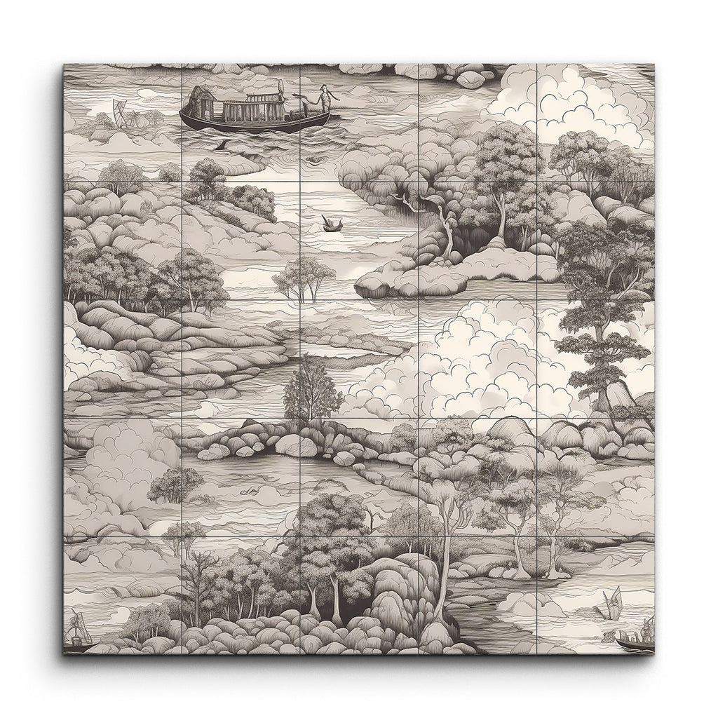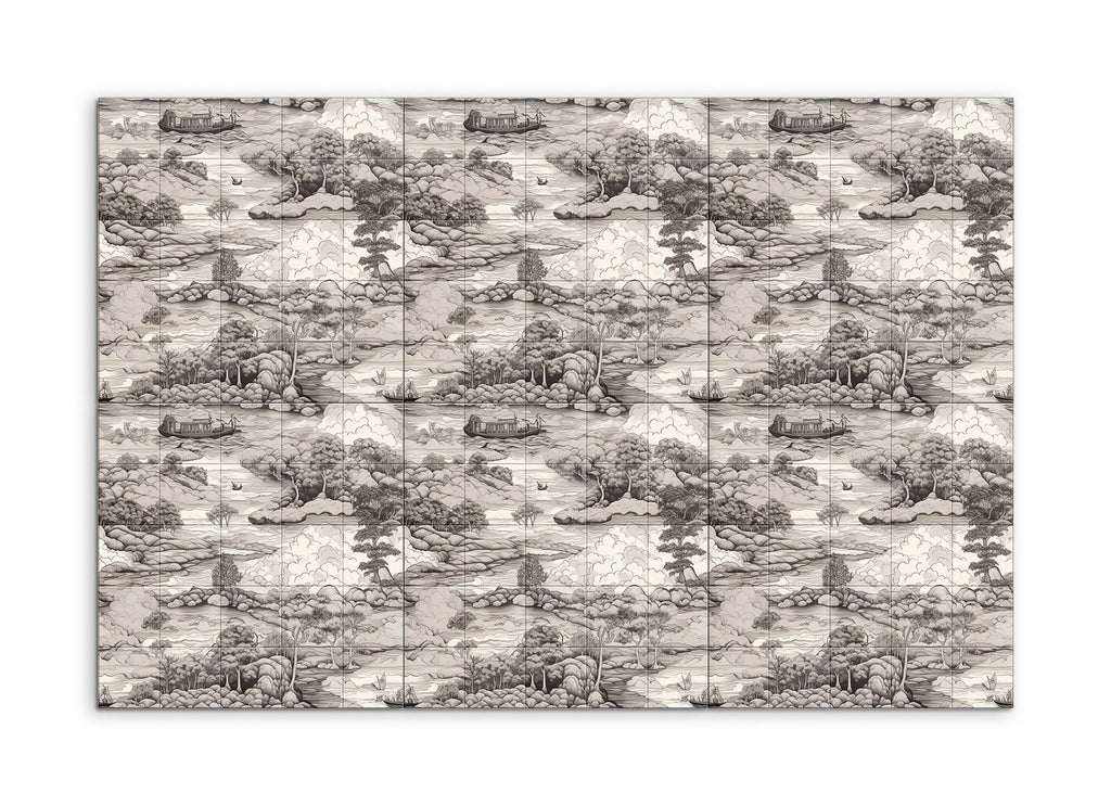 Immerse yourself in the tranquil beauty of this tile mural, depicting a serene monochromatic landscape. A winding river meanders through lush, hilly terrain, dotted with clusters of trees in varying textures. Small boats float gently on the river, while a larger houseboat adds a captivating focal point. The misty hills in the background and the billowing clouds merge seamlessly, evoking a sense of depth and peace. Inspired by traditional East Asian ink wash paintings, this artwork celebrates nature's serene beauty with meticulous detail.