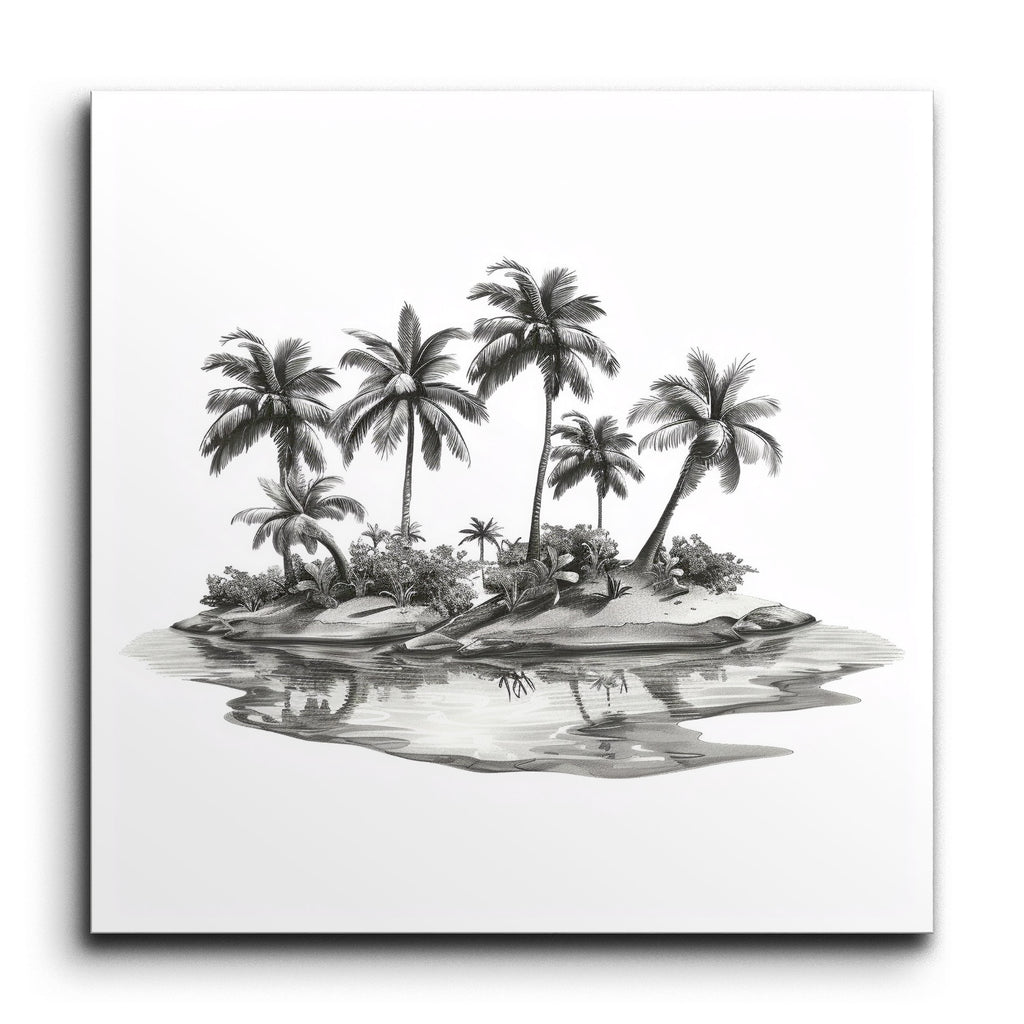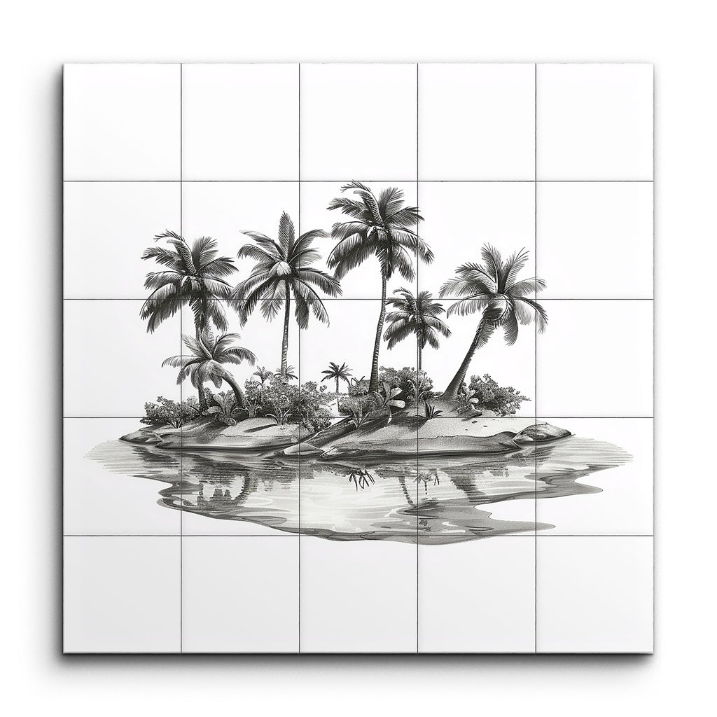 Immerse yourself in the serene beauty of a tropical paradise with this exquisite tile mural. The monochromatic artwork captures a tranquil island adorned with tall, slender palm trees, their fronds elegantly fanned out. Fine, delicate lines and careful shading bring depth and detail to the scene, reflecting the island's peaceful essence in the calm surrounding waters. This timeless piece, reminiscent of classic pen and ink techniques, exudes simplicity and elegance, making it a captivating addition to any space.